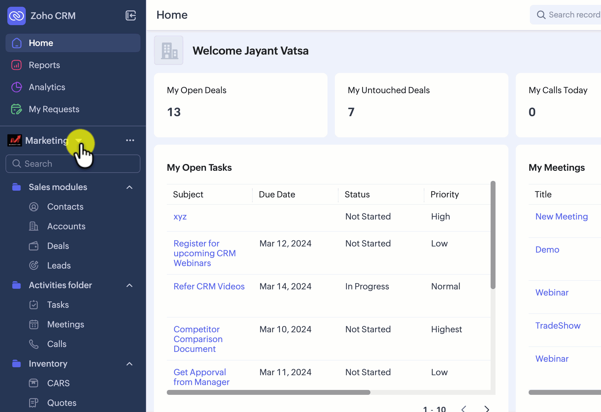 Additionally, once you have created folders in your teamspace, you can add modules to the teamspace using the 'Manage [Module]' option in the sidebar in your CRM account. For example, in the Marketing Team teamspace, there are two folders named "Sales Module" and "Activities Folder." This setup allows for the "Switch Folder" option since the folders were added during the teamspace creation, enabling the Leads module to be placed in the Sales Modules folder.
