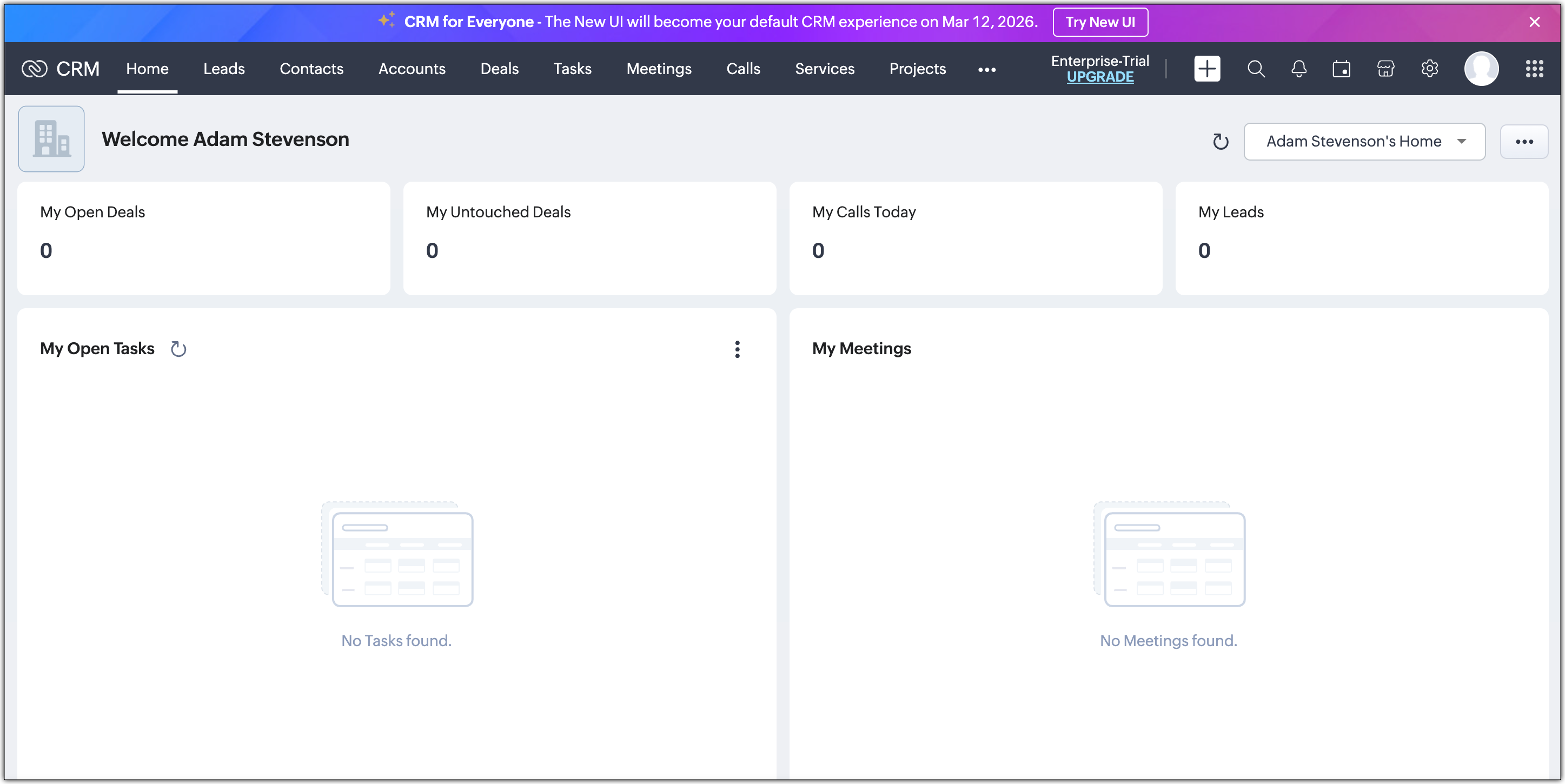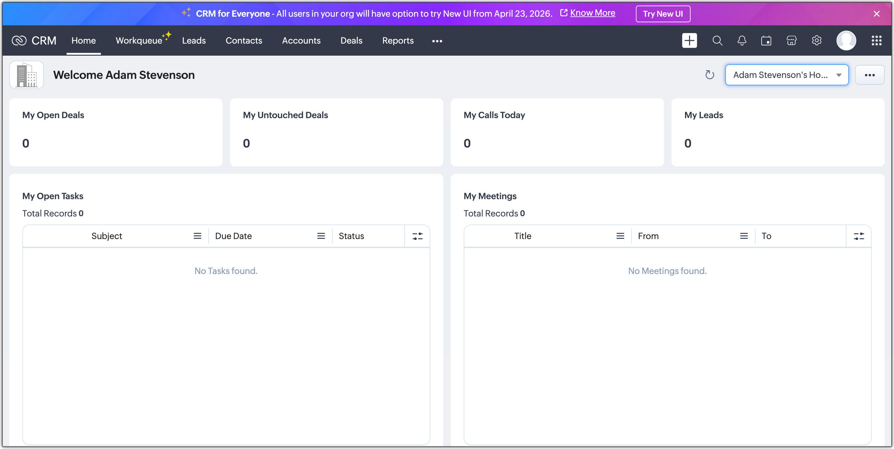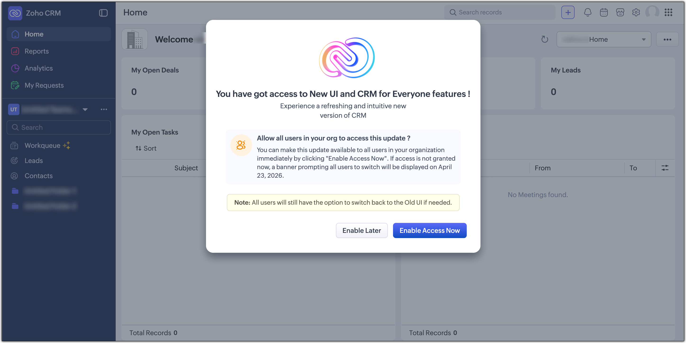For all larger organizations, we will first show a Try New UI banner for the admins so they can choose to enable Zoho CRM For Everyone for all users in their org immediately or later. If an admin chooses to :