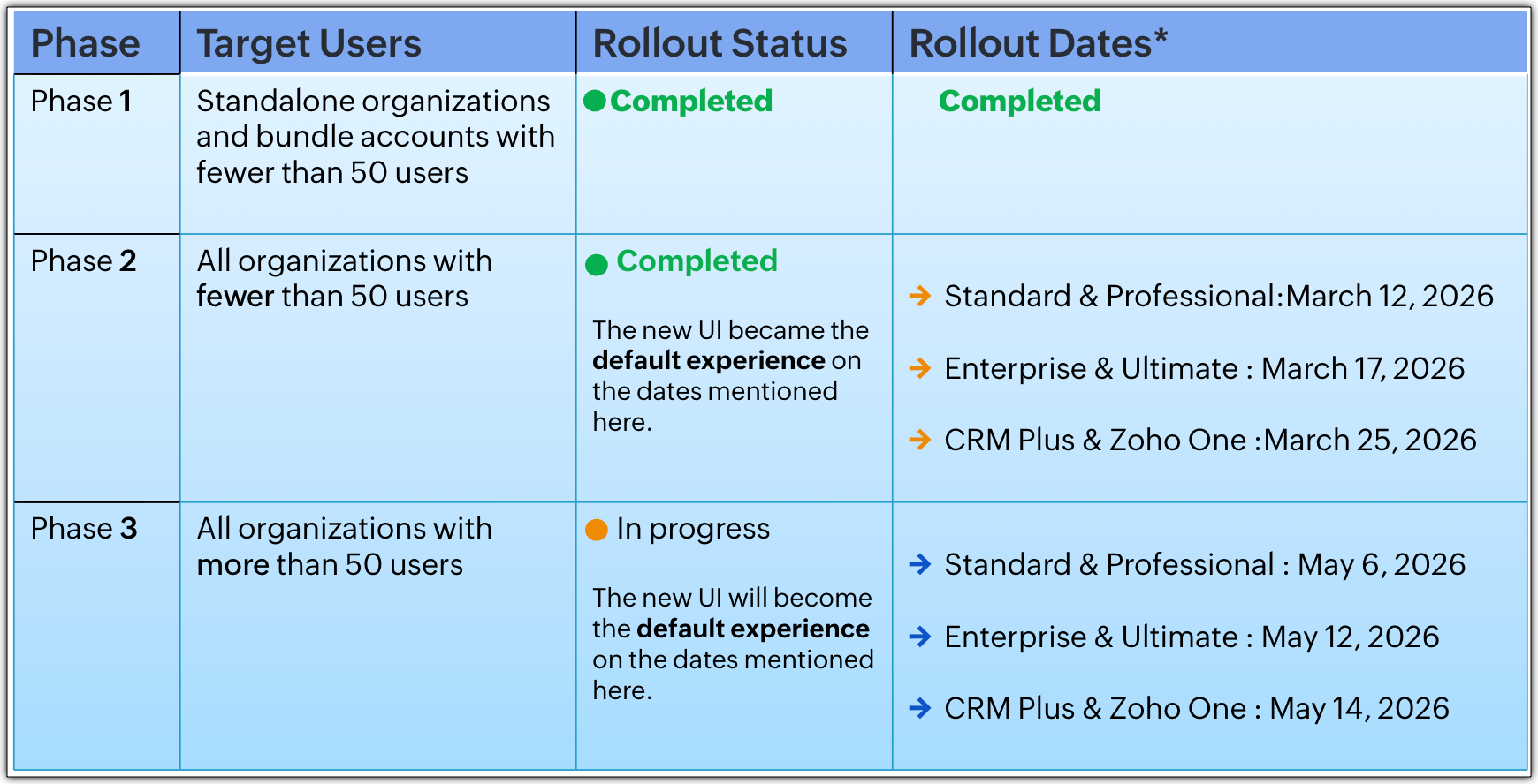 We have started rolling out the new Zoho CRM For Everyone UI as the default experience for all users. This update is being released in three phases based on organization size and account type. We want to keep you informed of the rollout progress so you can plan ahead and support your clients during the transition.