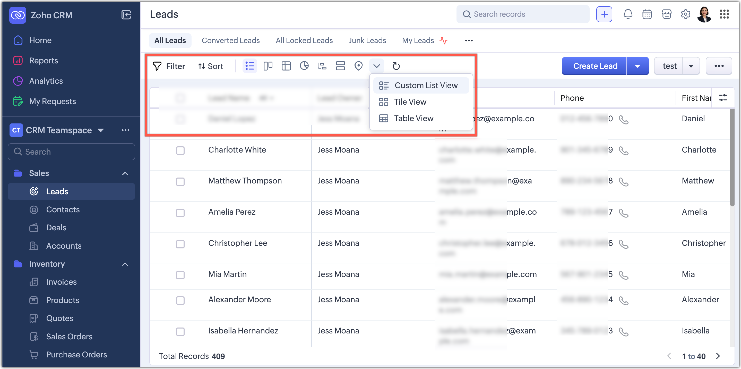 The filter option, currently, is available separately on top next to the custom view option. Similarly, record view for the module is also placed on top next to Create Record button and opens up as a drop-down for you to choose from.