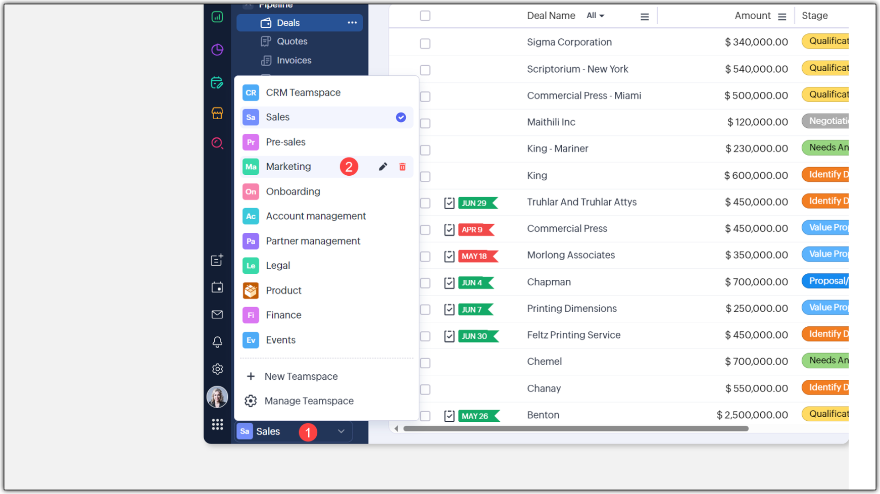 - Managing CRM teamspaces will now open out into a pop-up at the far-right of your screen.