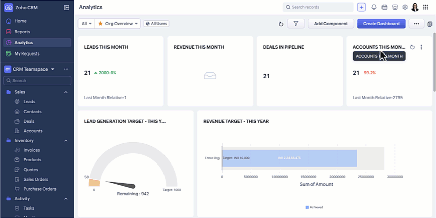 Earlier, Reports and Analytics modules will list the various reports and dashboards created on the secondary sidebar. Accessing other modules from reports and dashboards requires multiple clicks as shown in the GIF below.