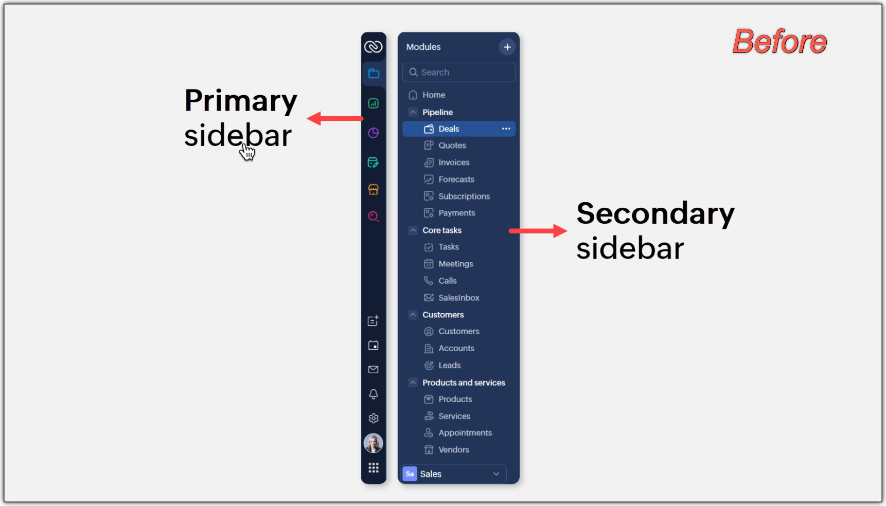 The new version uses one unified sidebar. Modules and folders now appear as a scrollable list. This gives you more space to view records and reduces the clicks needed to move between modules.