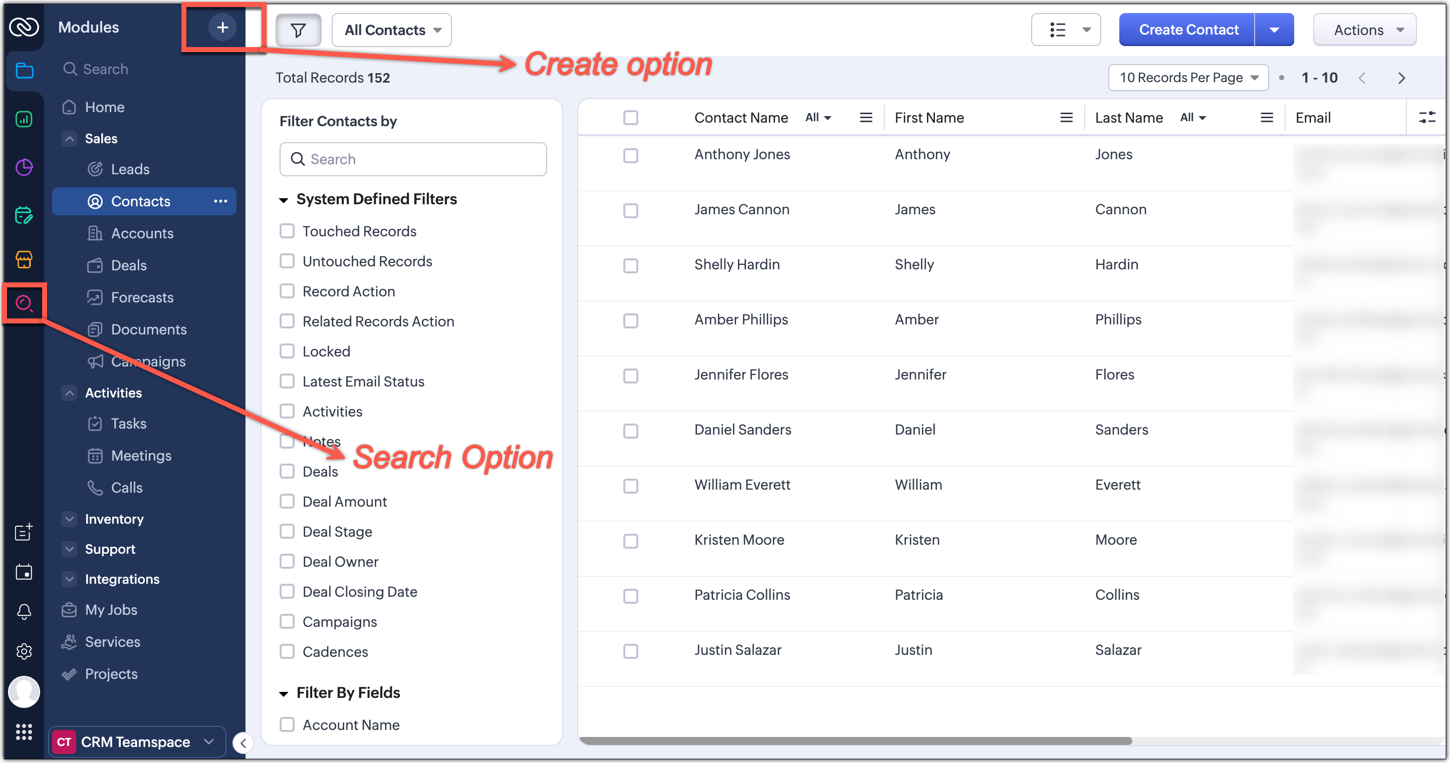 In this upgraded version, global search now lives at the top of your CRM screen. The Quick Create menu has also been merged with the '+' icon from the Modules Tab in this enhancement so all quick create actions can be carried out from one single place. From here, you can: