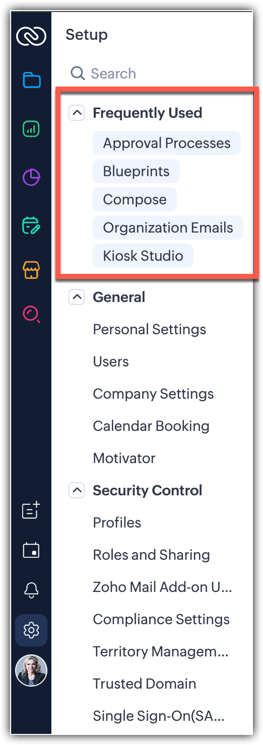 Typically, the feature that was accessed the most will be displayed at the top of this list. You can find the Frequently used option in the Setup menu of the CRM system, as shown in the screenshot below.