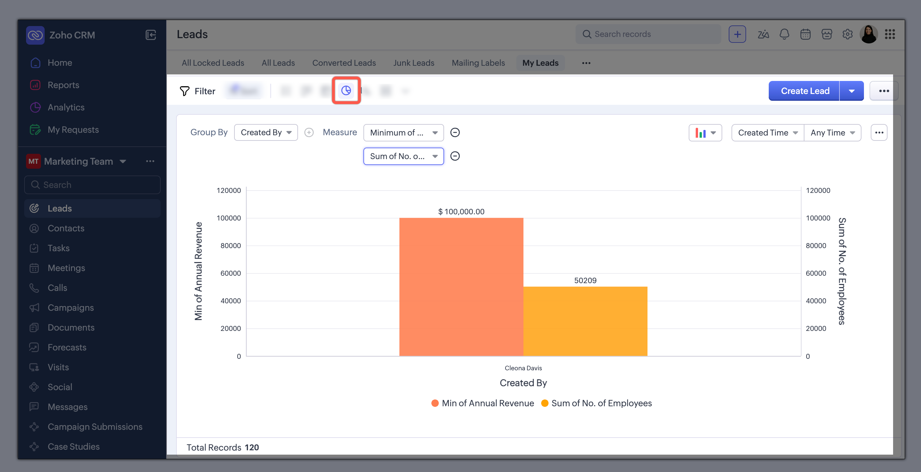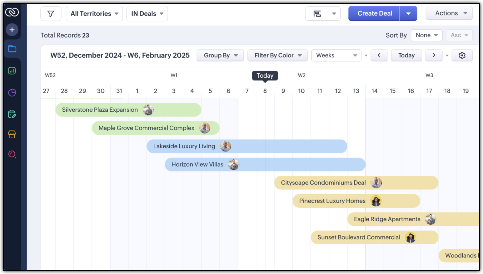 Use this view to get a visual representation of all records in your module plotted over a period of time. View the records by days, weeks, months, or quarters to derive important time-centric inferences.