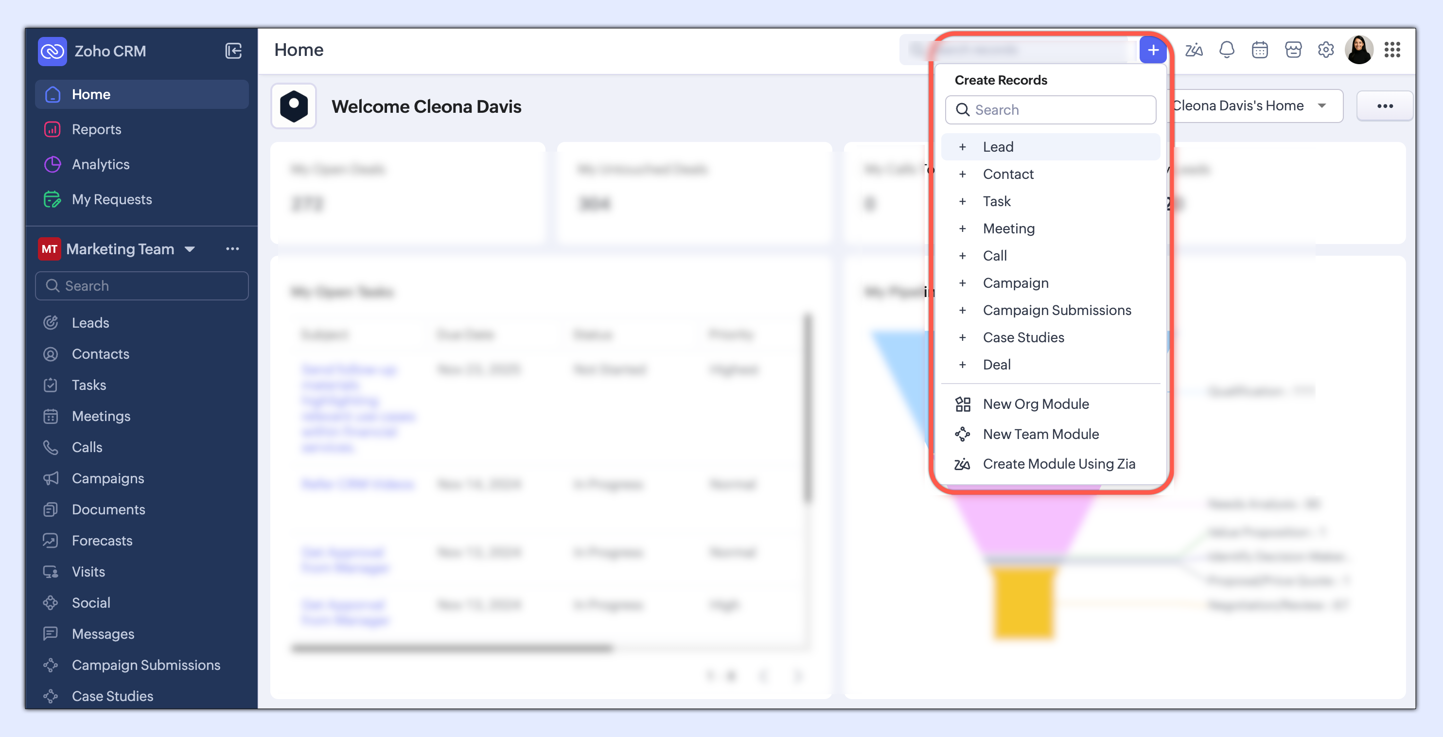 - Create team modules or organization modules from the Quick Create "+" option next to Global search. You can also quickly create new records or create modules using Zia from here. No more navigating to the Setup menu for this action.