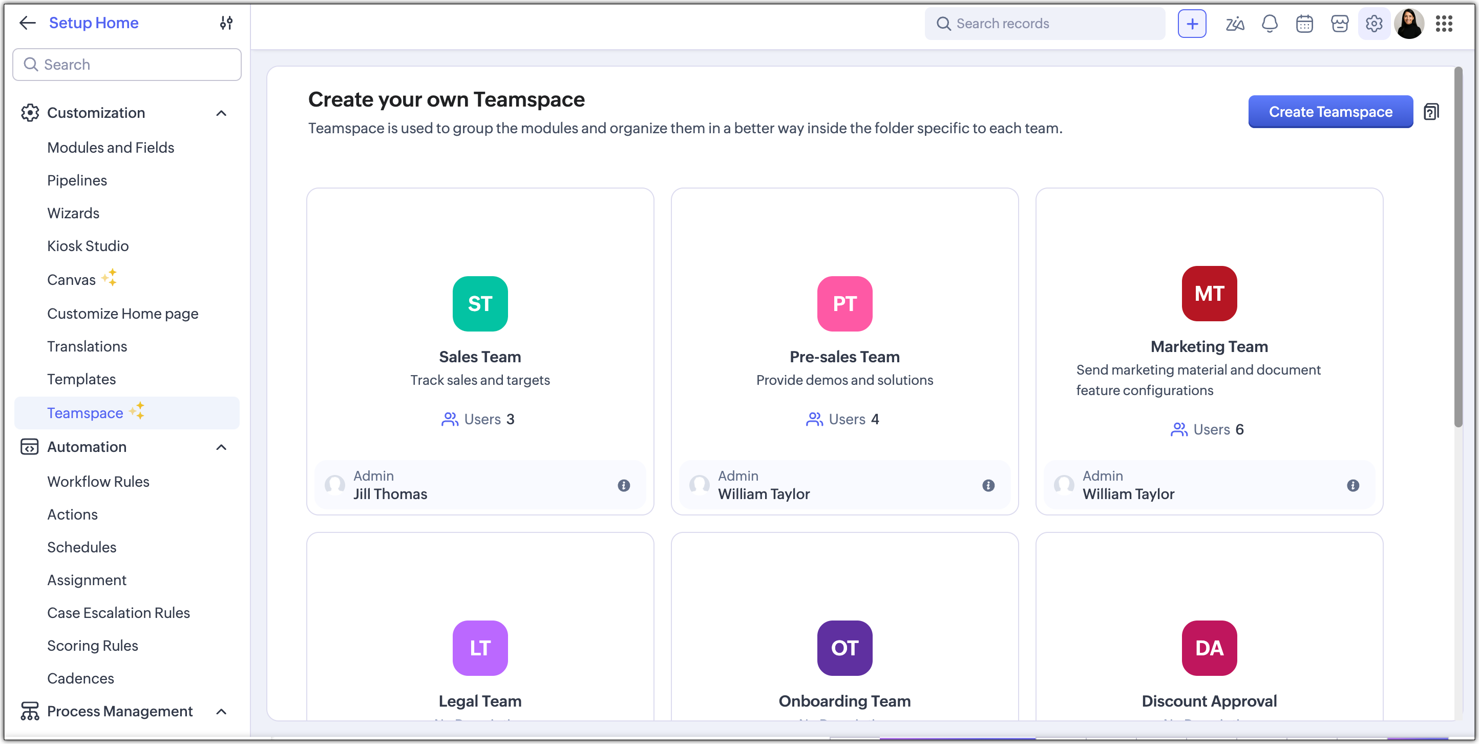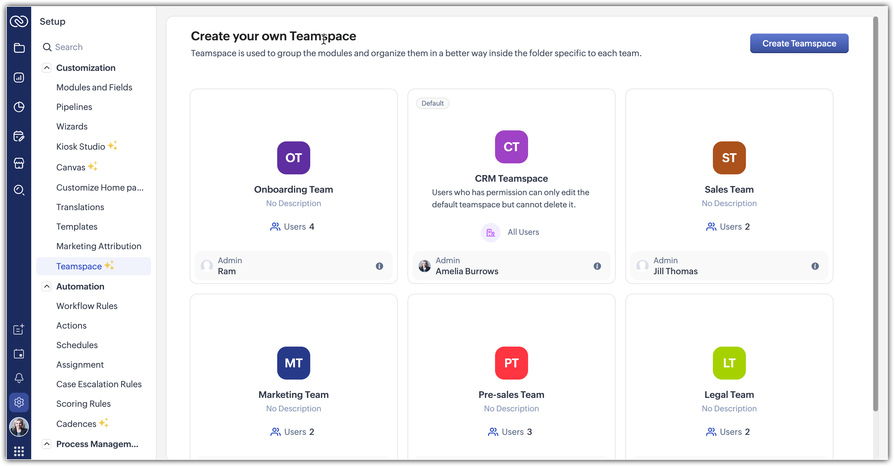 We've introduced Teamspaces to allow team members from various departments to collaborate and work together on a single CRM platform for faster business operations.