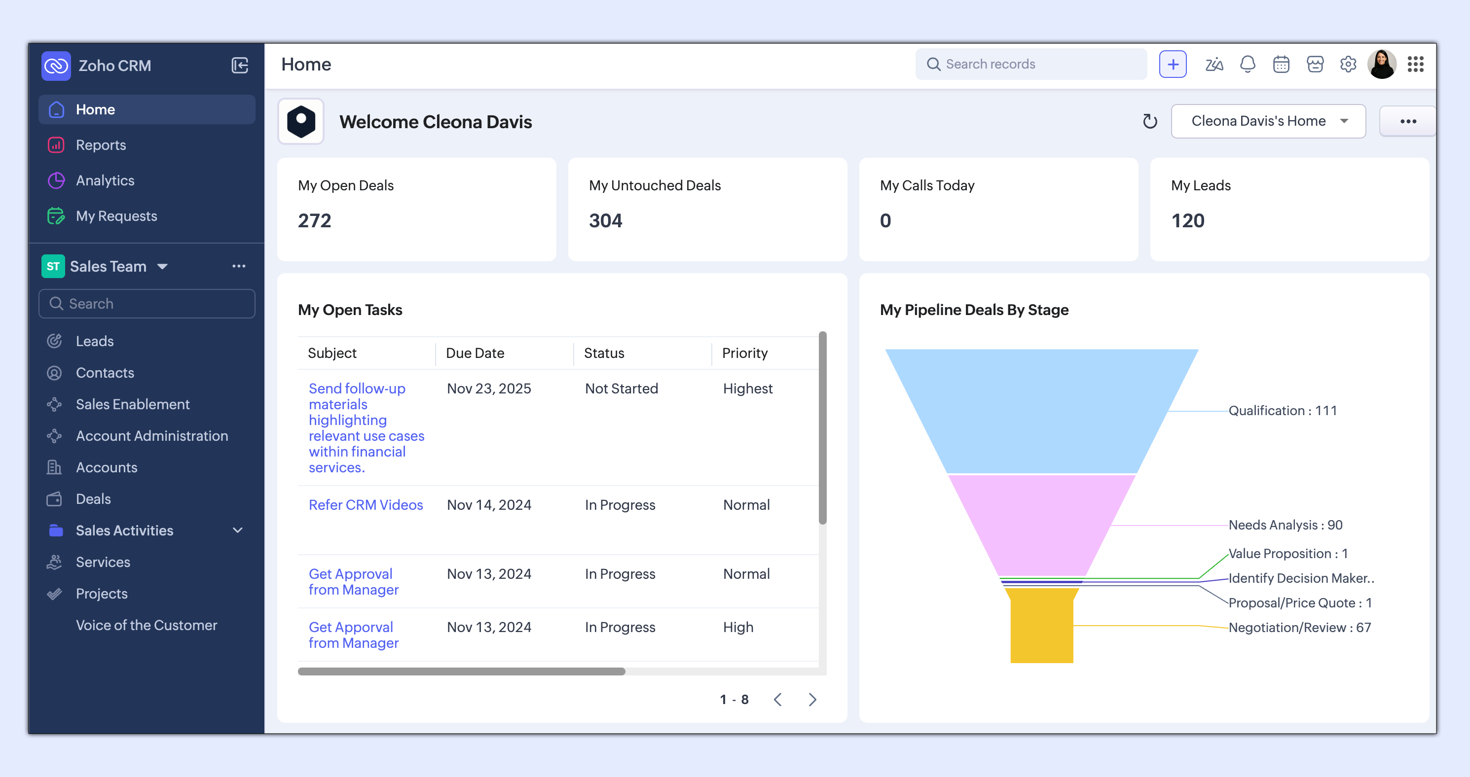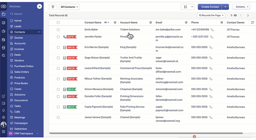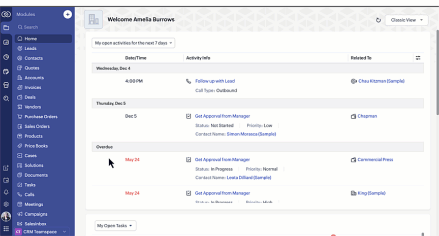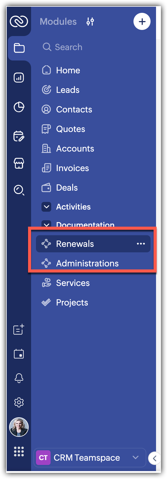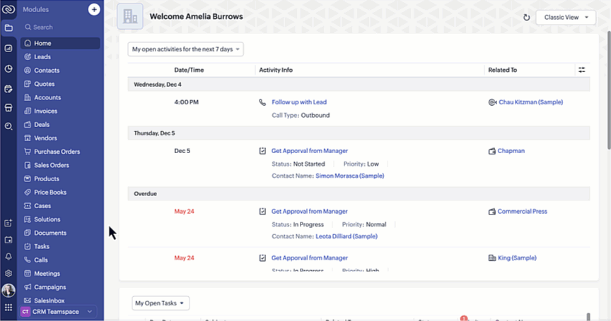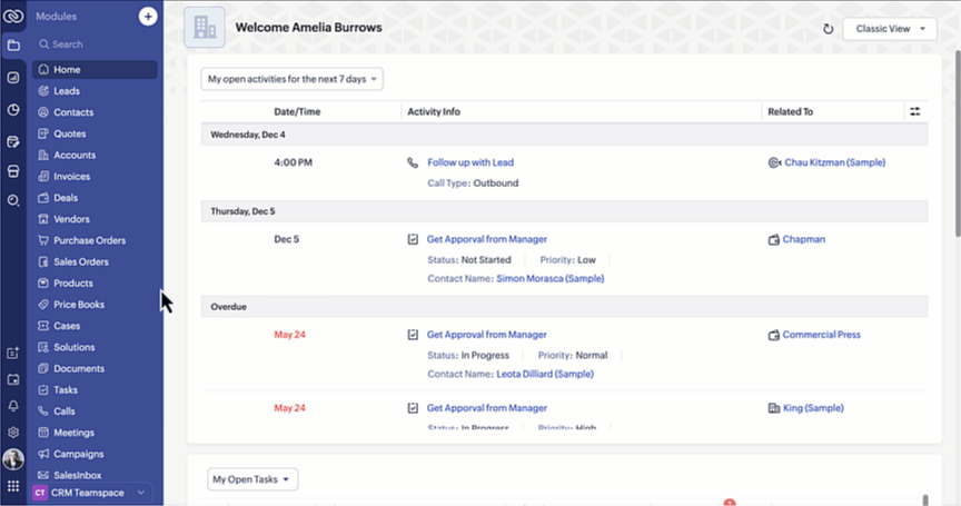 - The left-hand menu organizes all key modules vertically, making it easier to navigate through your CRM without excessive scrolling or clicks.