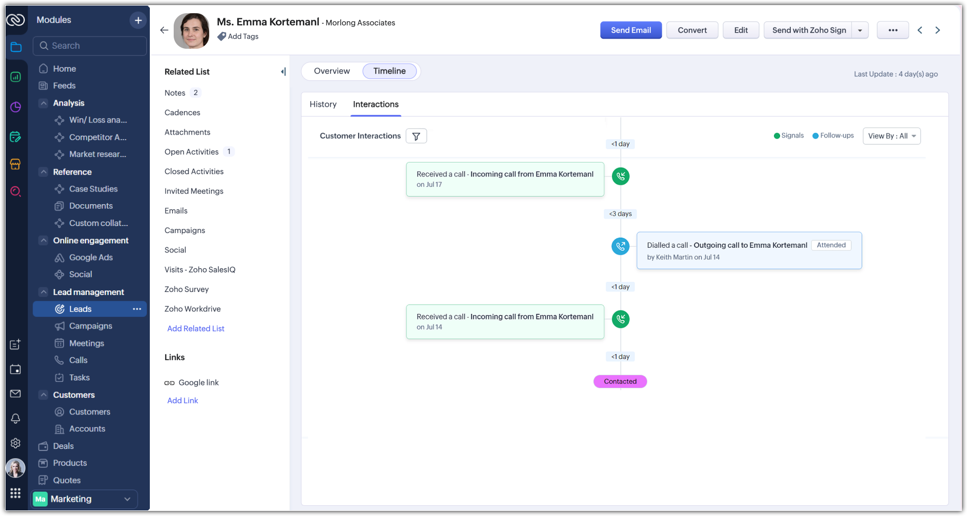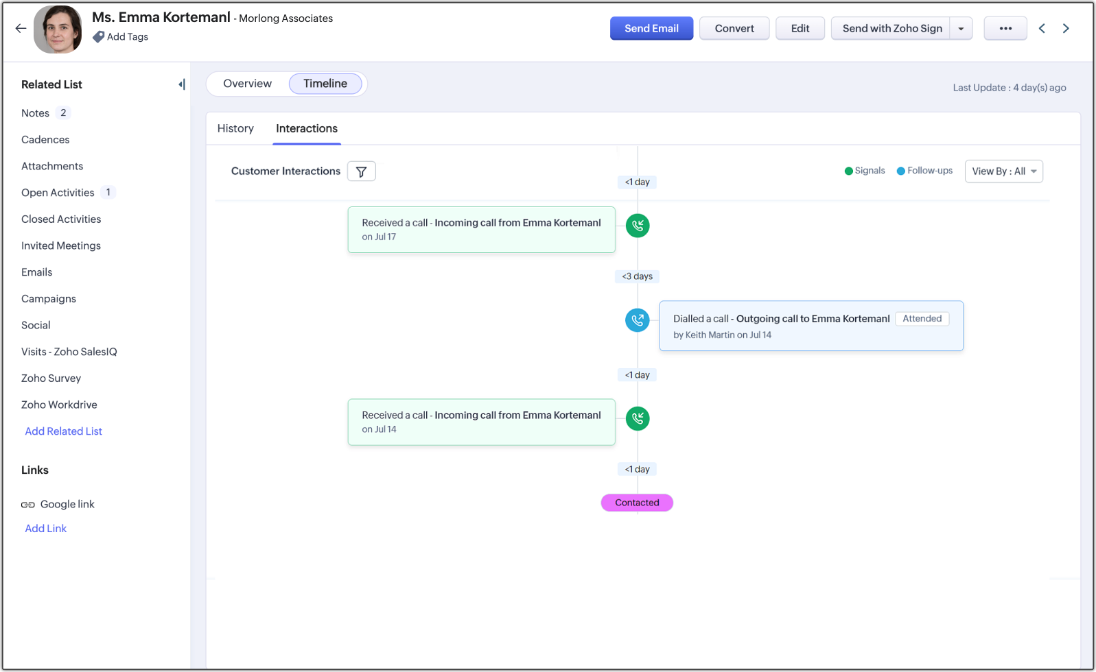 Each customer's journey in your CRM is unique, and hence, a seamless omni-channel engagement would help customer-facing teams understand the complete journey of contacts from the time they've been added to their current state in the CRM.