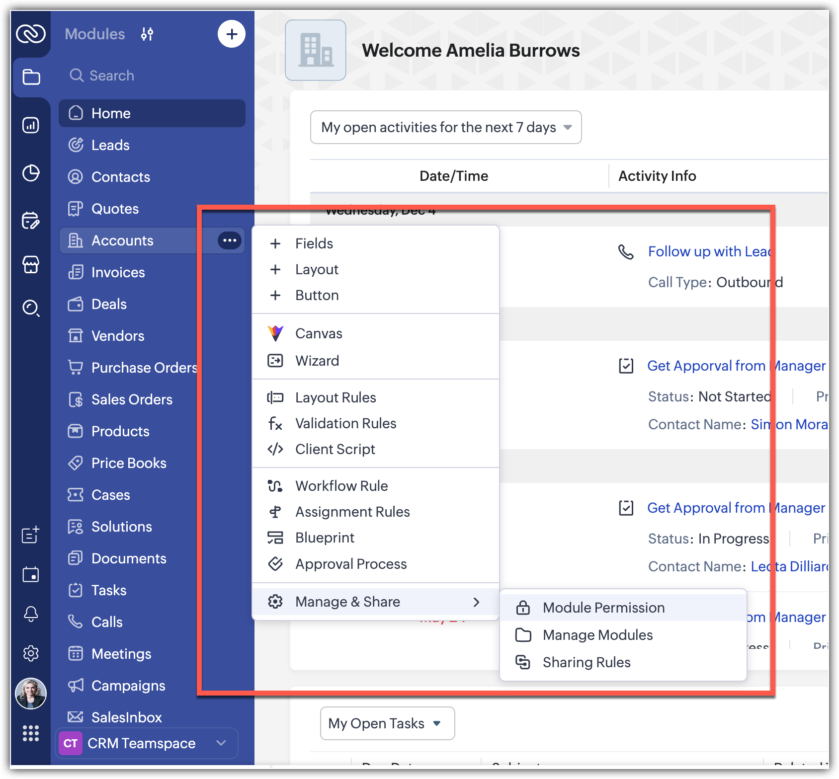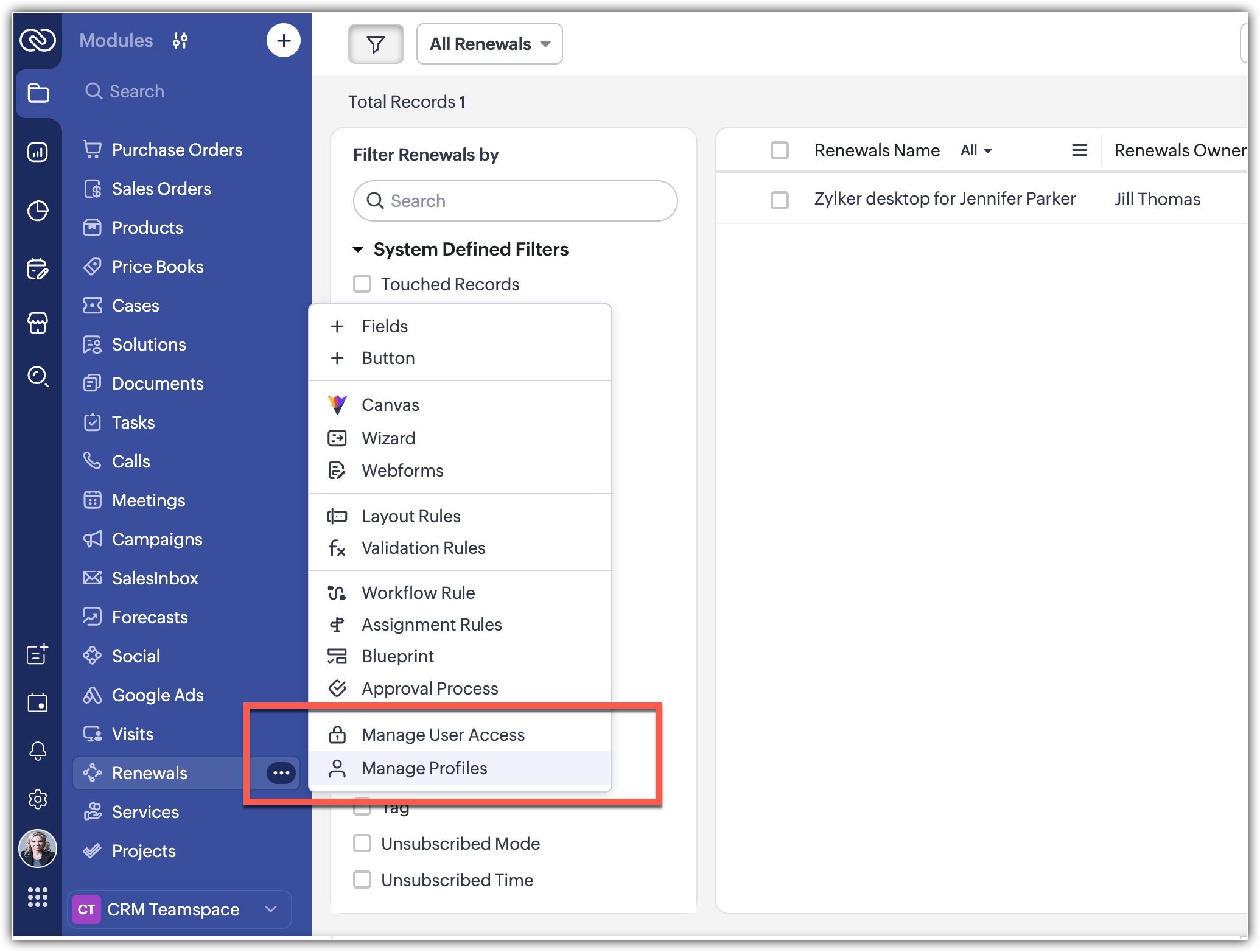 - Click the more option to configure different automation processes, edit field and button layouts for your modules right from the sidebar.