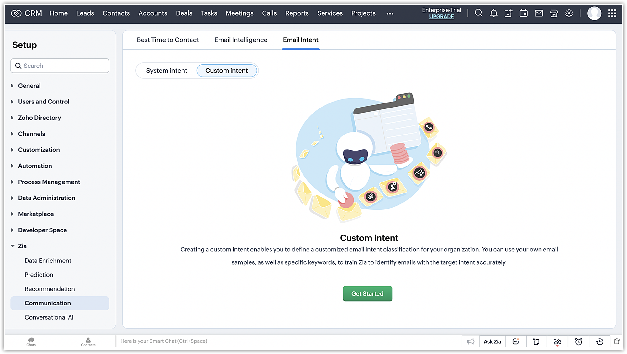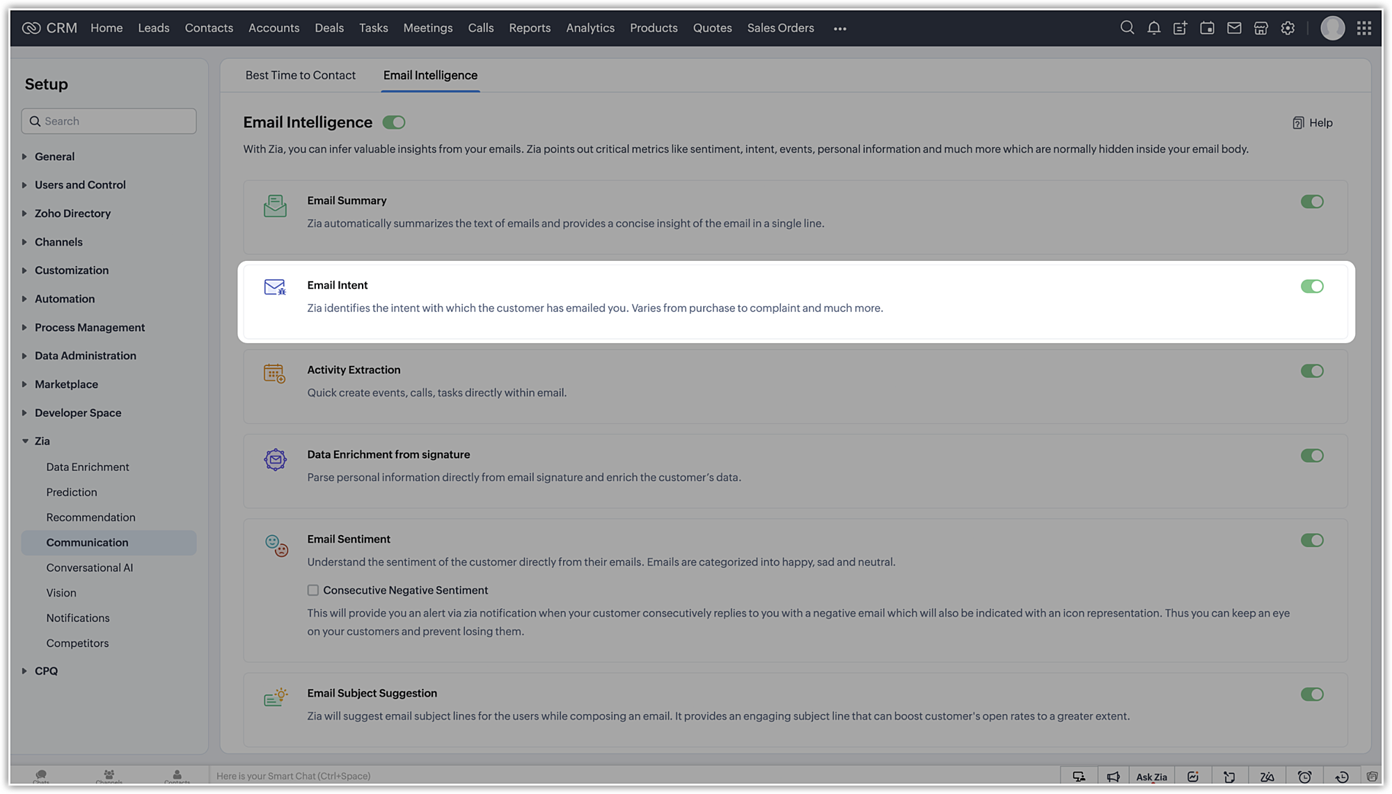 - Go to Zia, click the Email Intelligence tab in Communication.