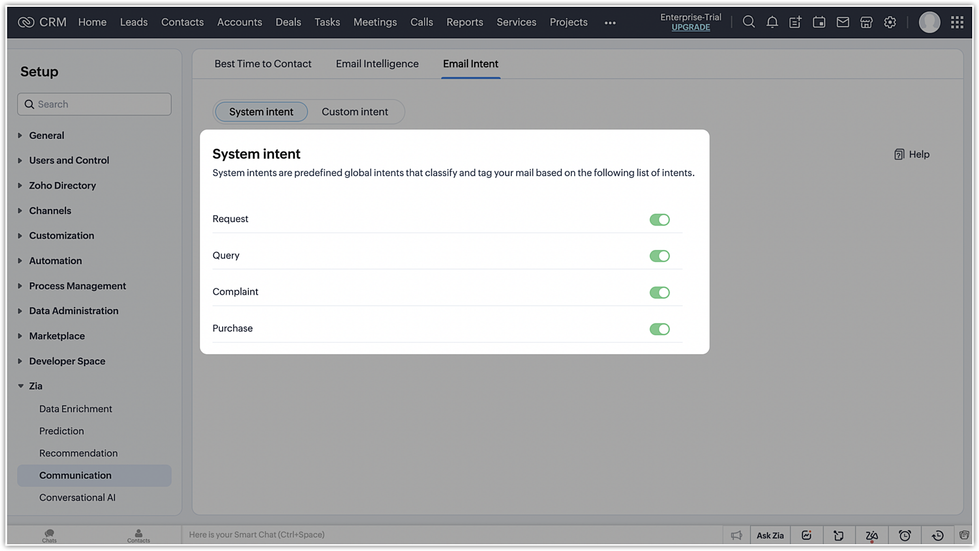 In the System Intent tab available under Email Intent, you can toggle the system-defined intents to enable and disable their suggestions by Zia. By default, upon enabling email intent, the system defined intents are automatically enabled.