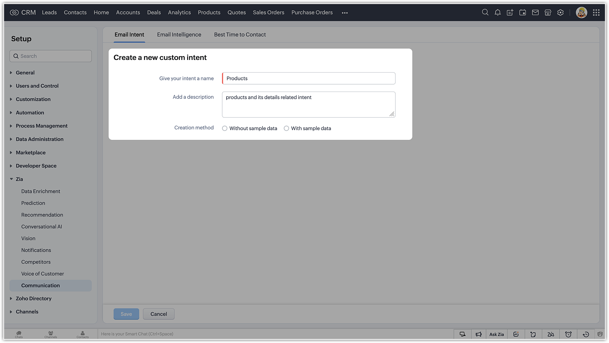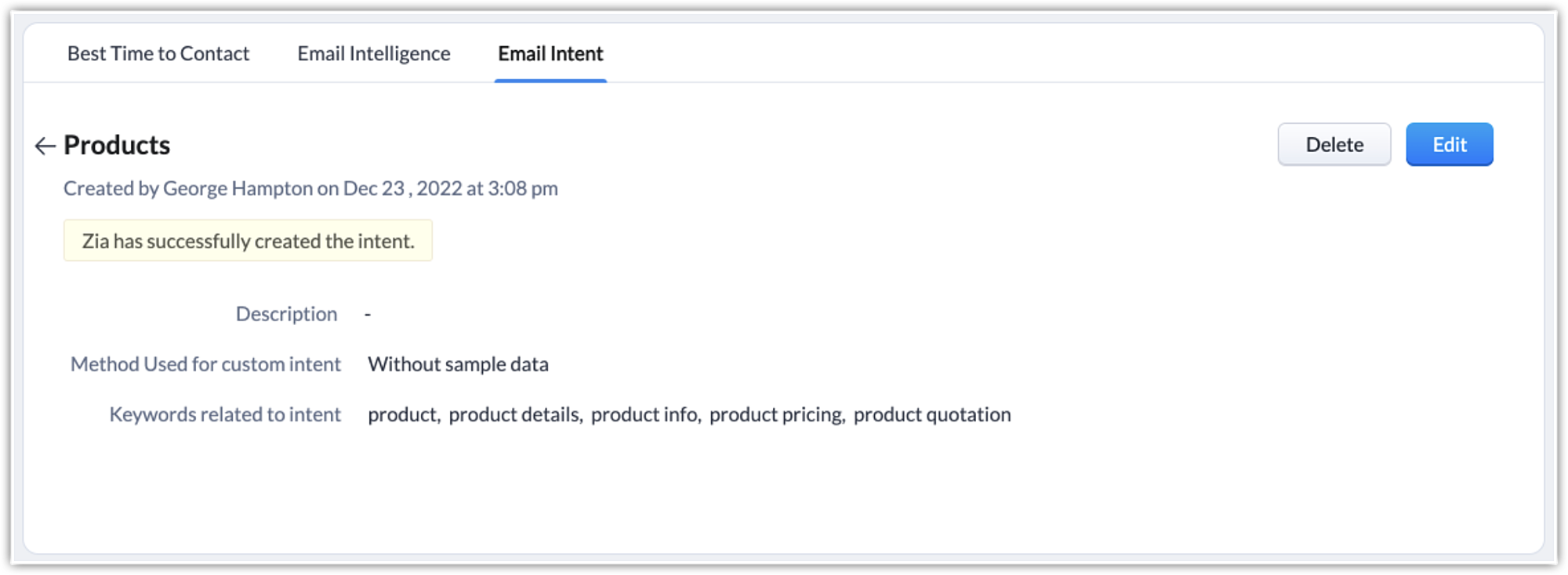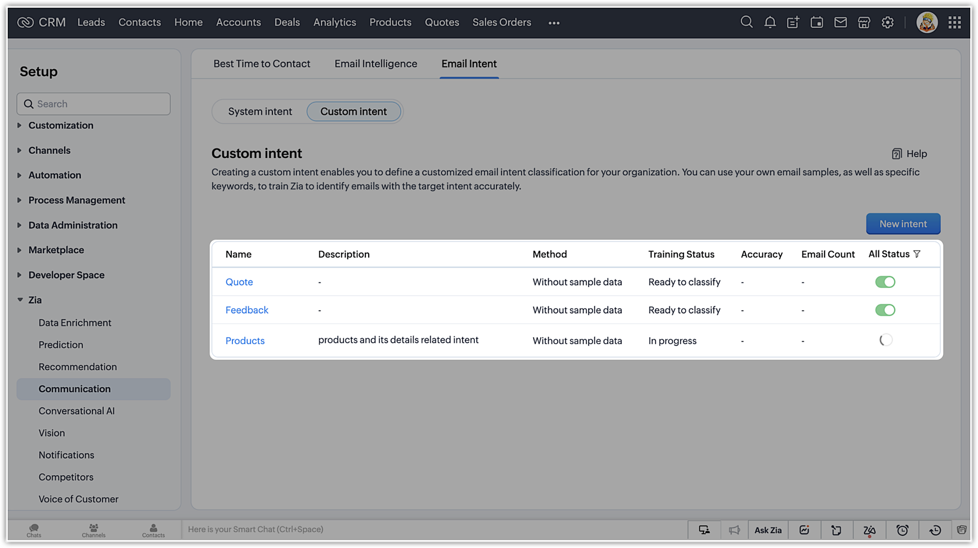 Different organizations follow different business processes, and have varying requirements when it comes to customer interactions. In addition to the system-defined intents, you may require a custom email intent specifically curated for the organization. This can be done with the help of custom intent functionality. Zia will be trained on the email samples provided and come up with the intent suggestions specific to their business needs.