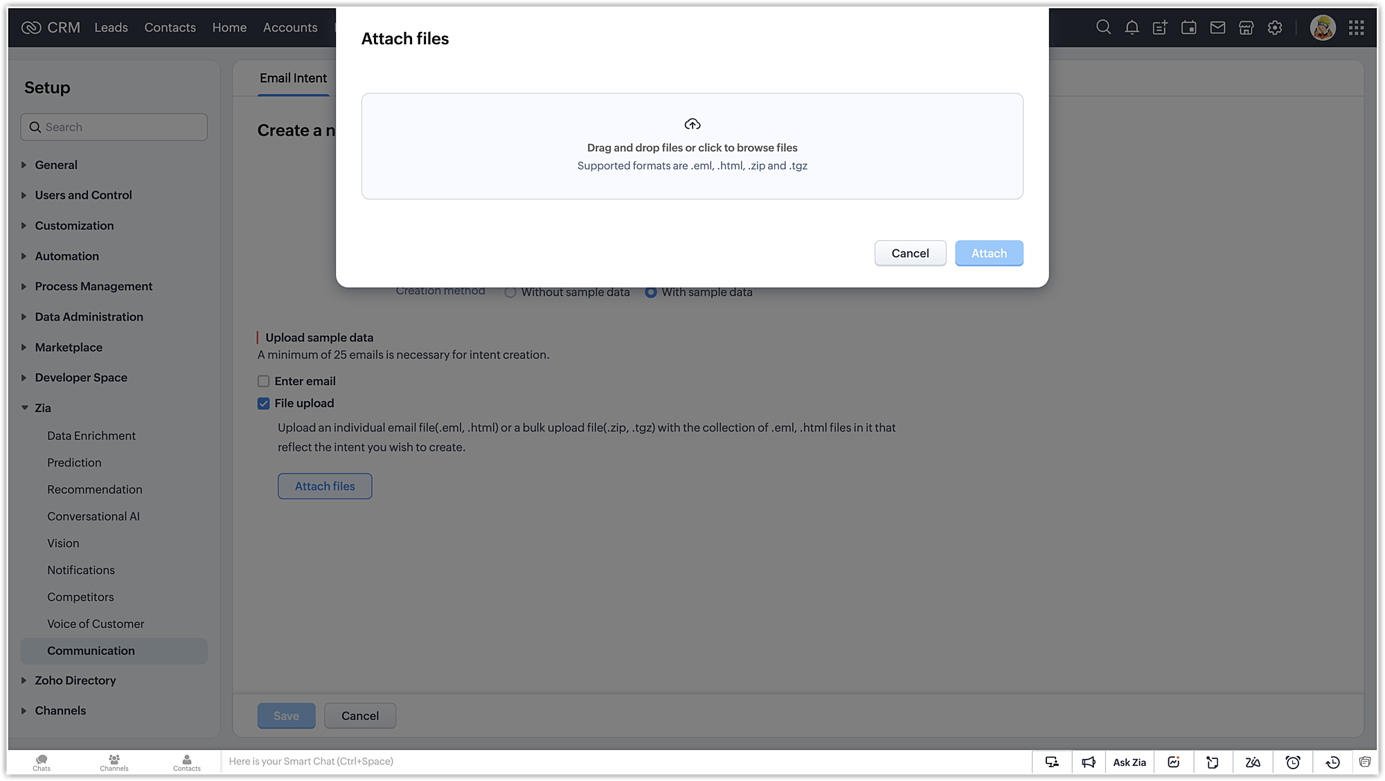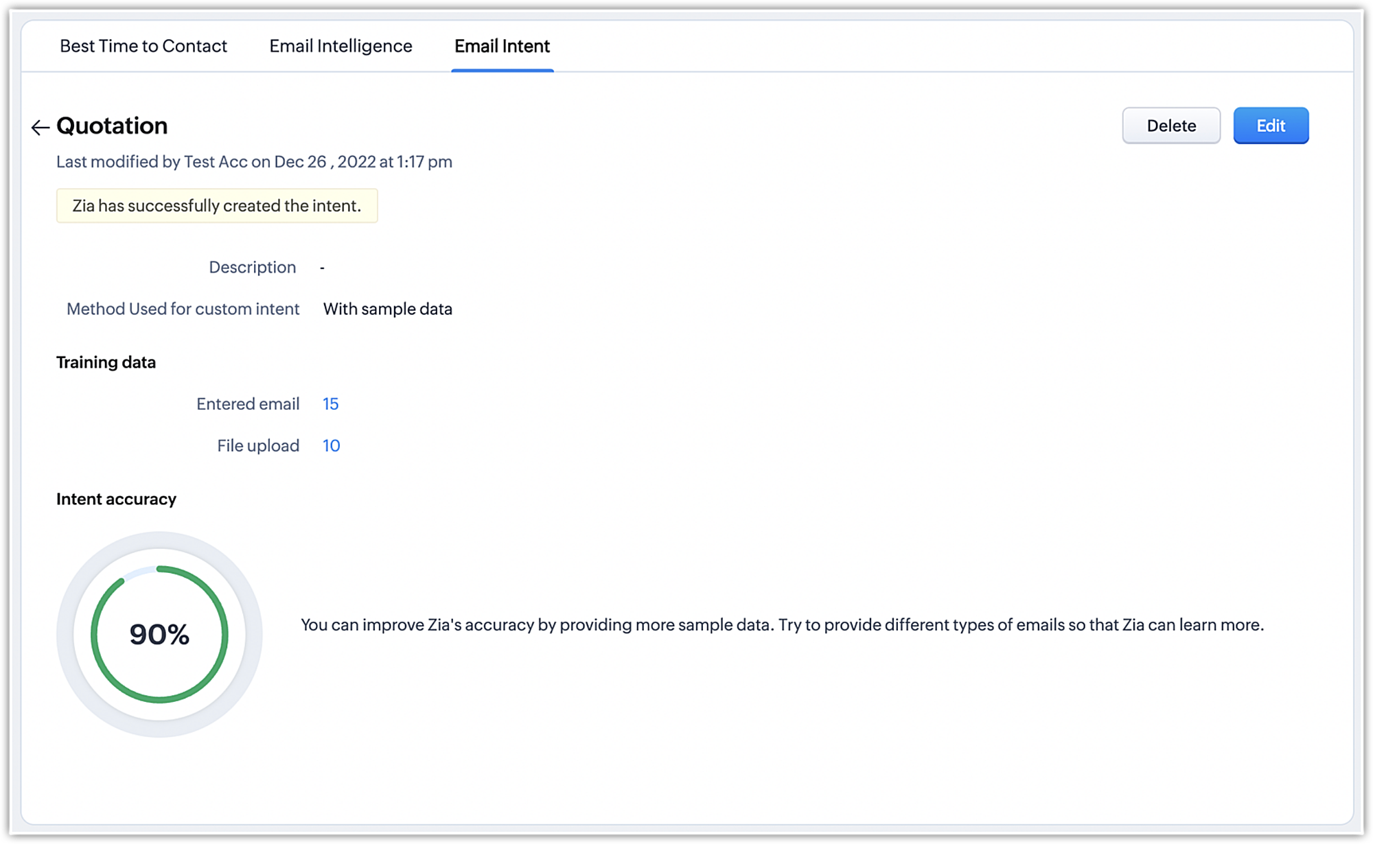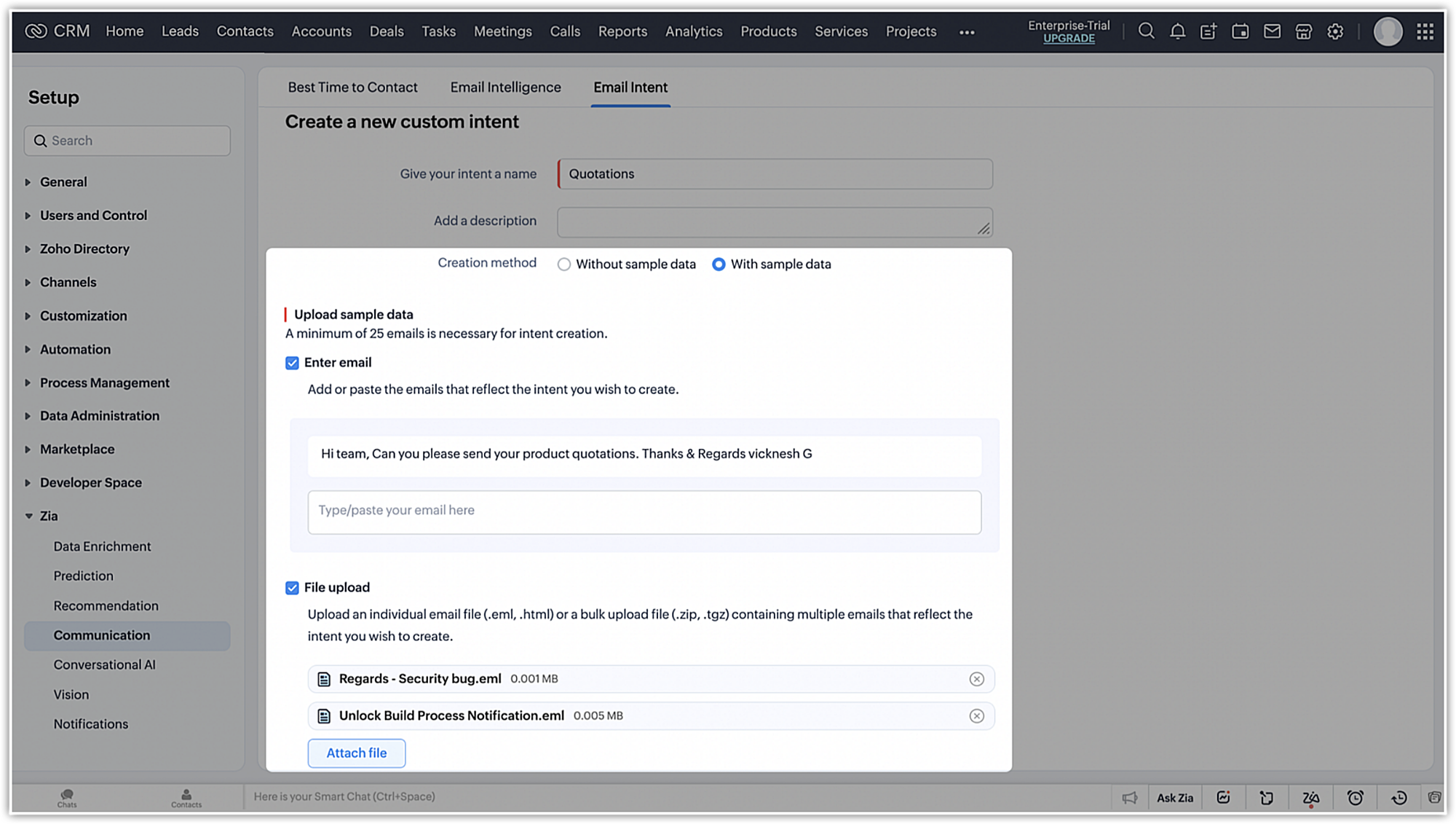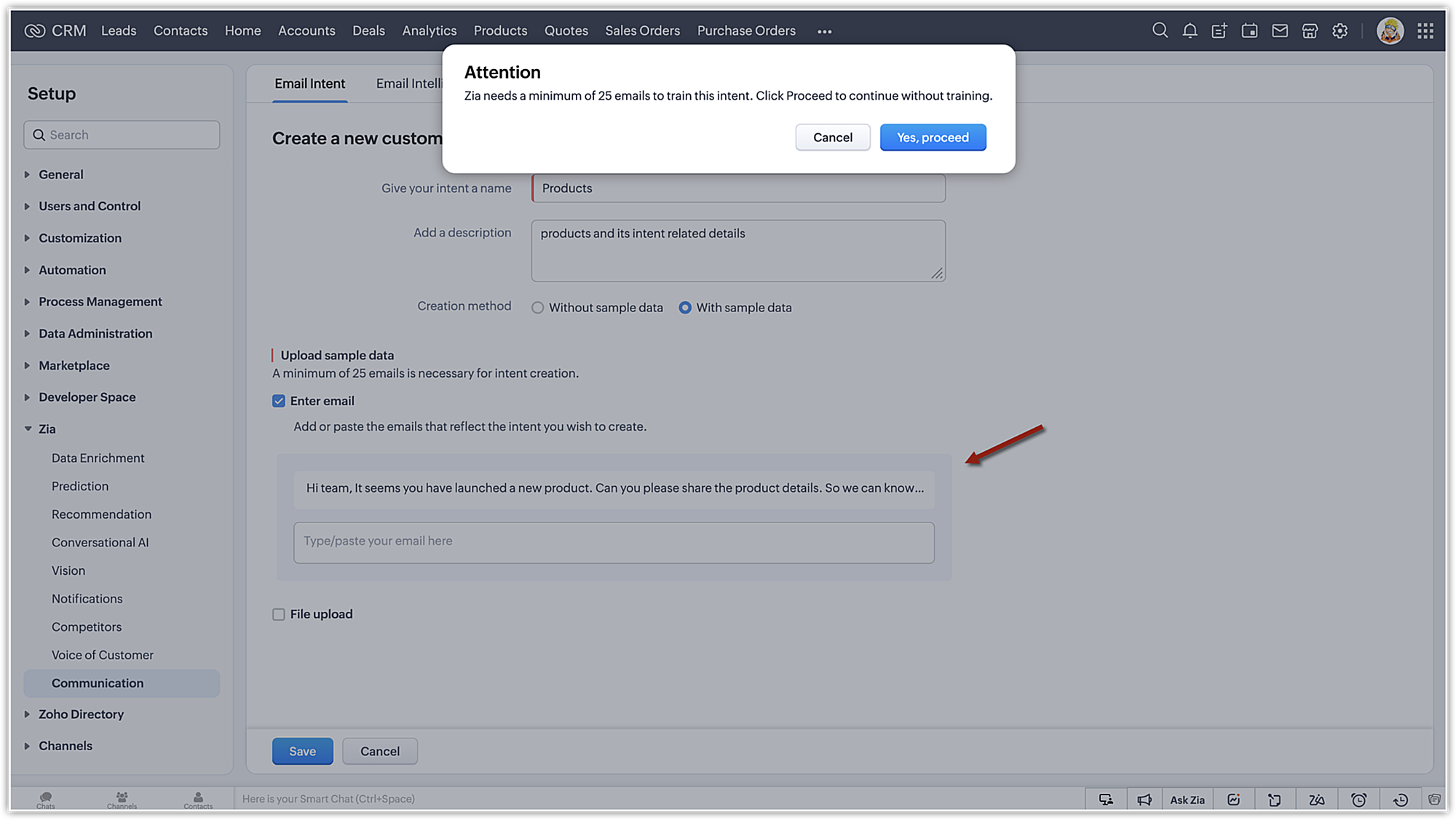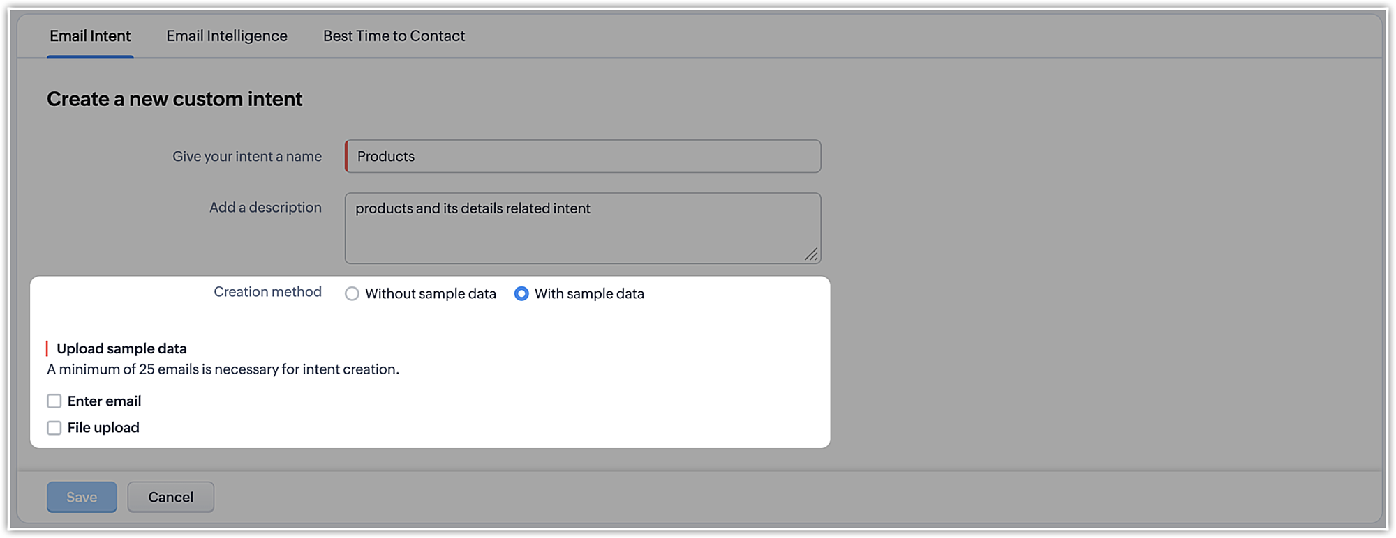 - For intents with sample data, a minimum of 25 sample email contents are required for Zia to start training for the custom intent. The 25 sample contents can be any combination of entered emails or uploaded files. If you have provided less than 25 sample emails, you can still continue to save the custom intent but it Zia will not be training on this.
