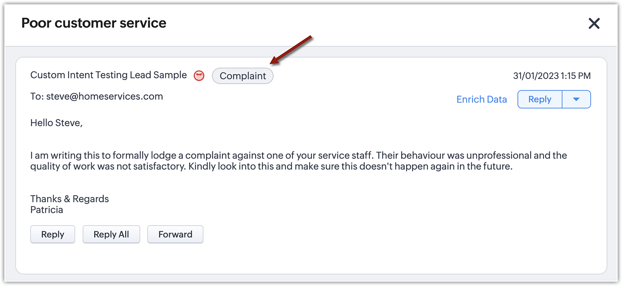 This is where Zia pitches in its email intent analysis feature. It monitors the email conversations to understand the intent of the customer, classifies the intent of each email and tags them accordingly. You can set up system defined intents or even have your own custom intents based on your organization's needs.