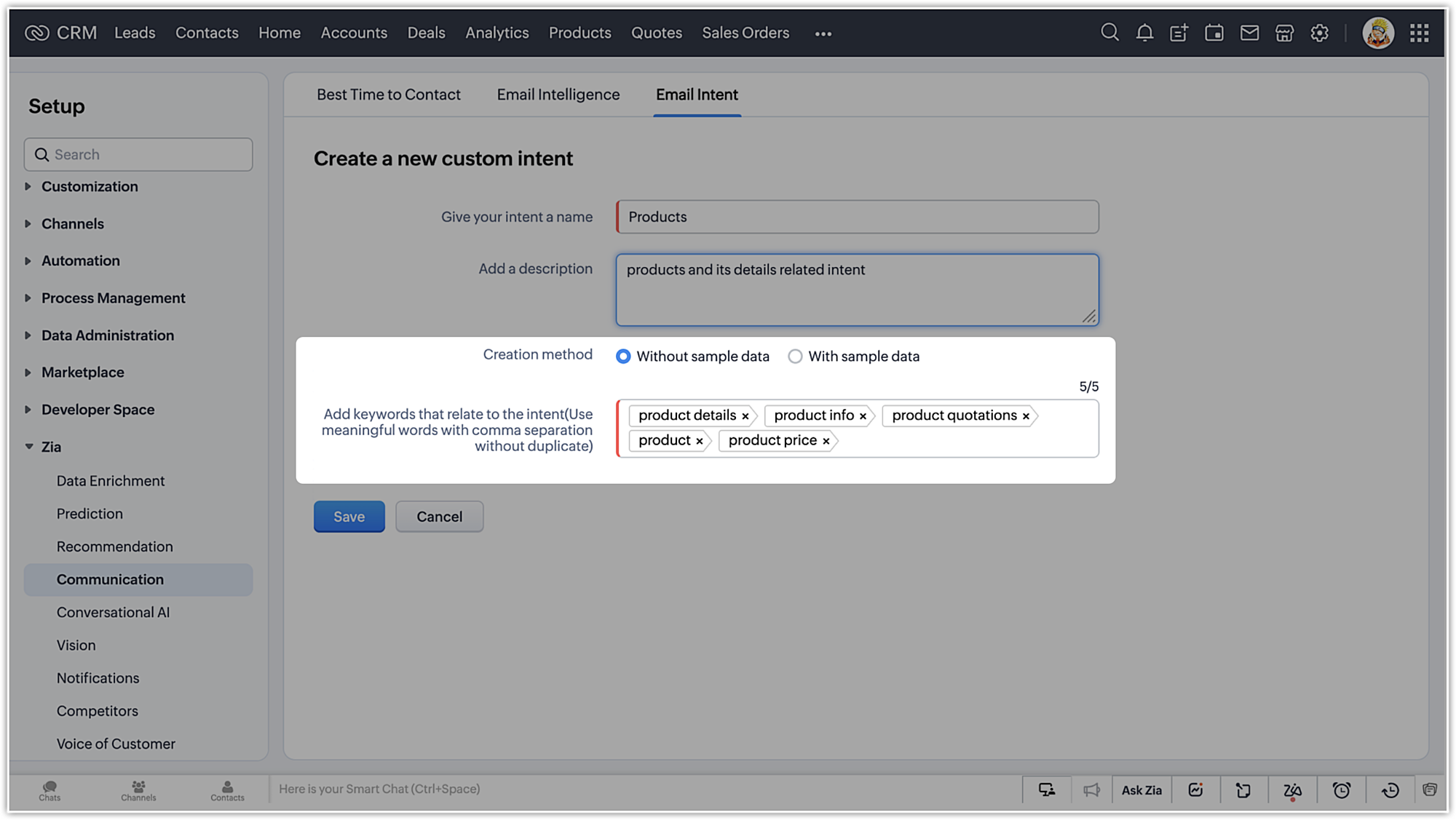 - Add up to five keywords that relate to the intent for Zia to look up for in a new incoming email.