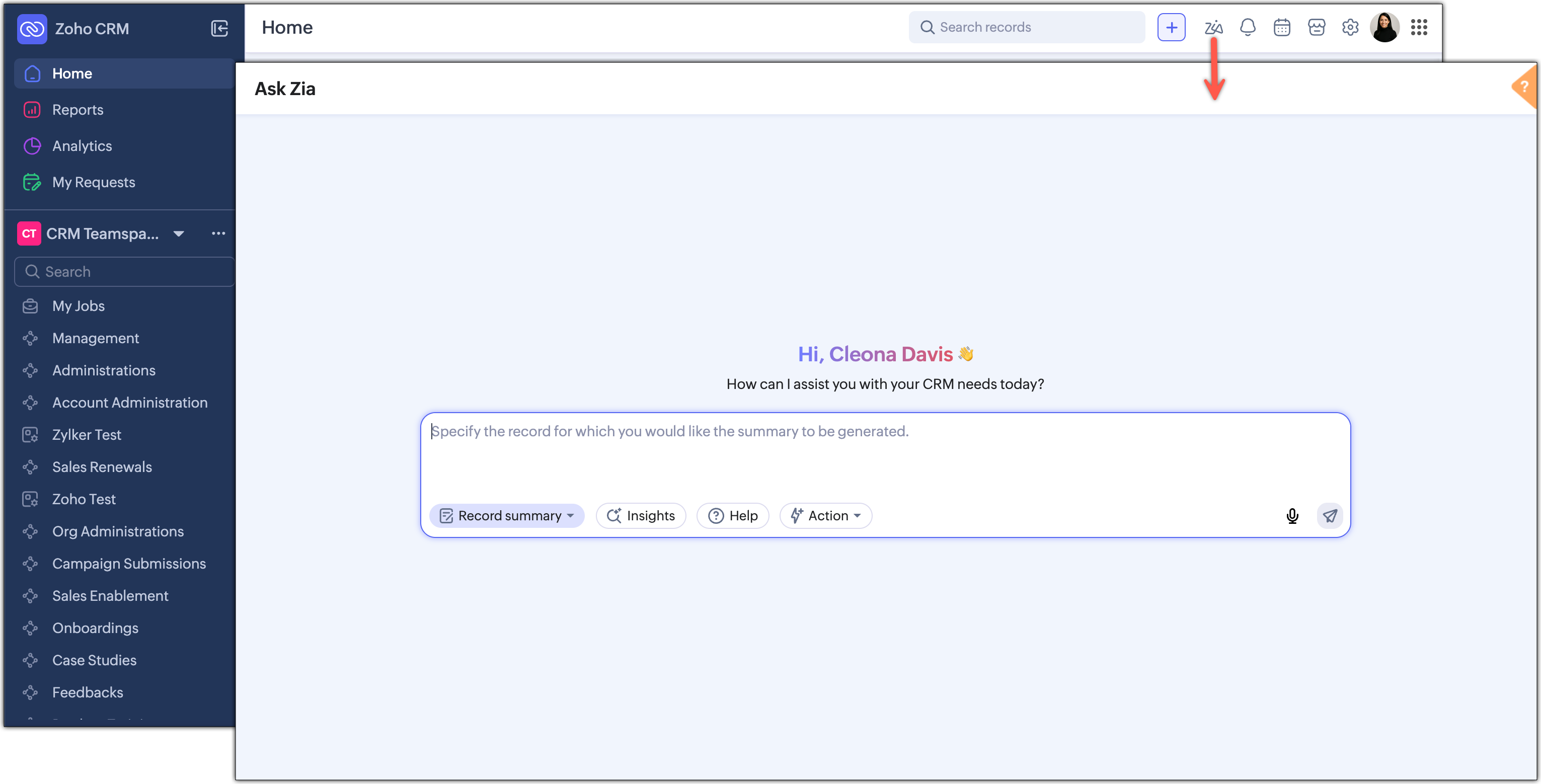 - Each question can relate to one module only. Currently, Zia will not be able to answer questions that involve more than one module.