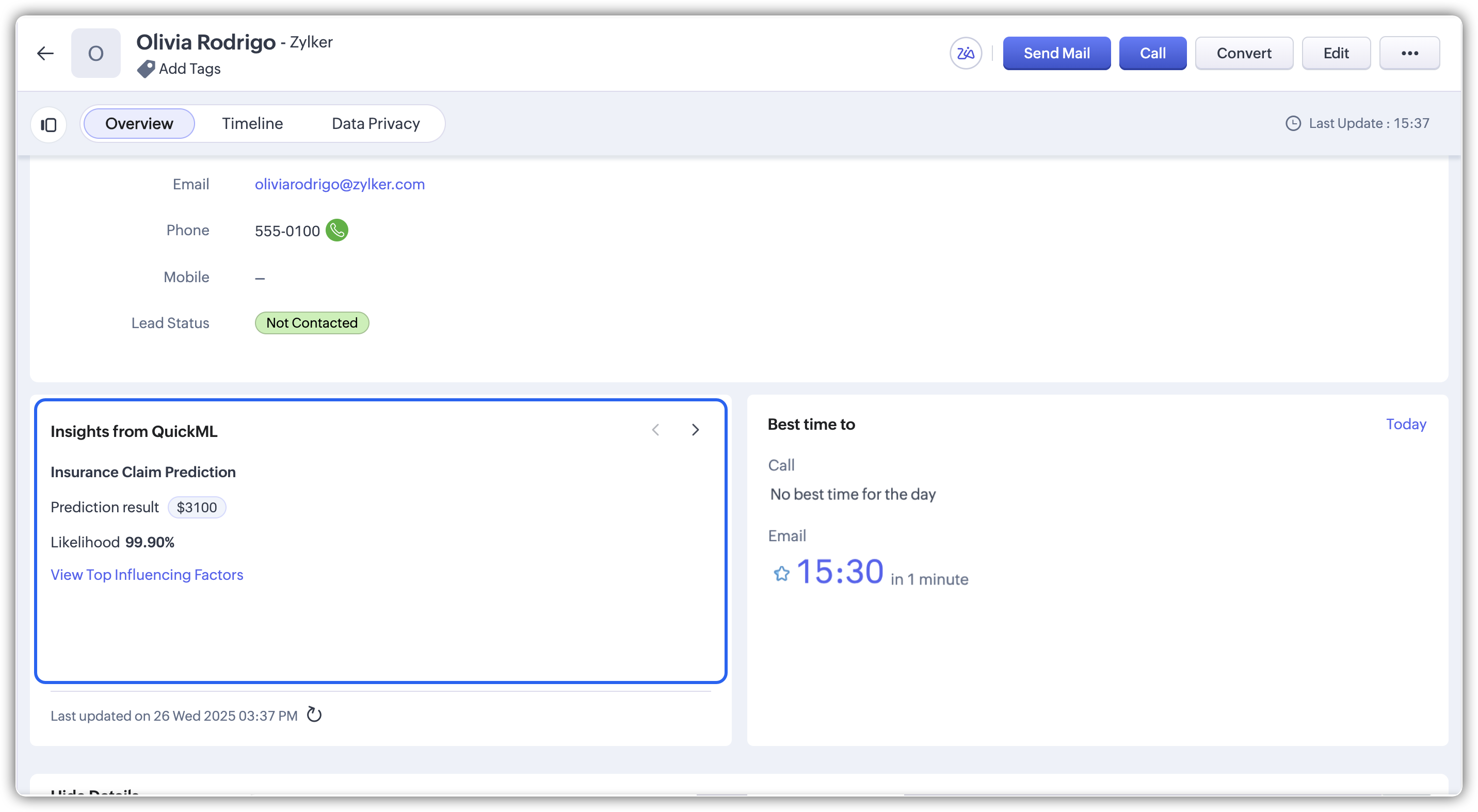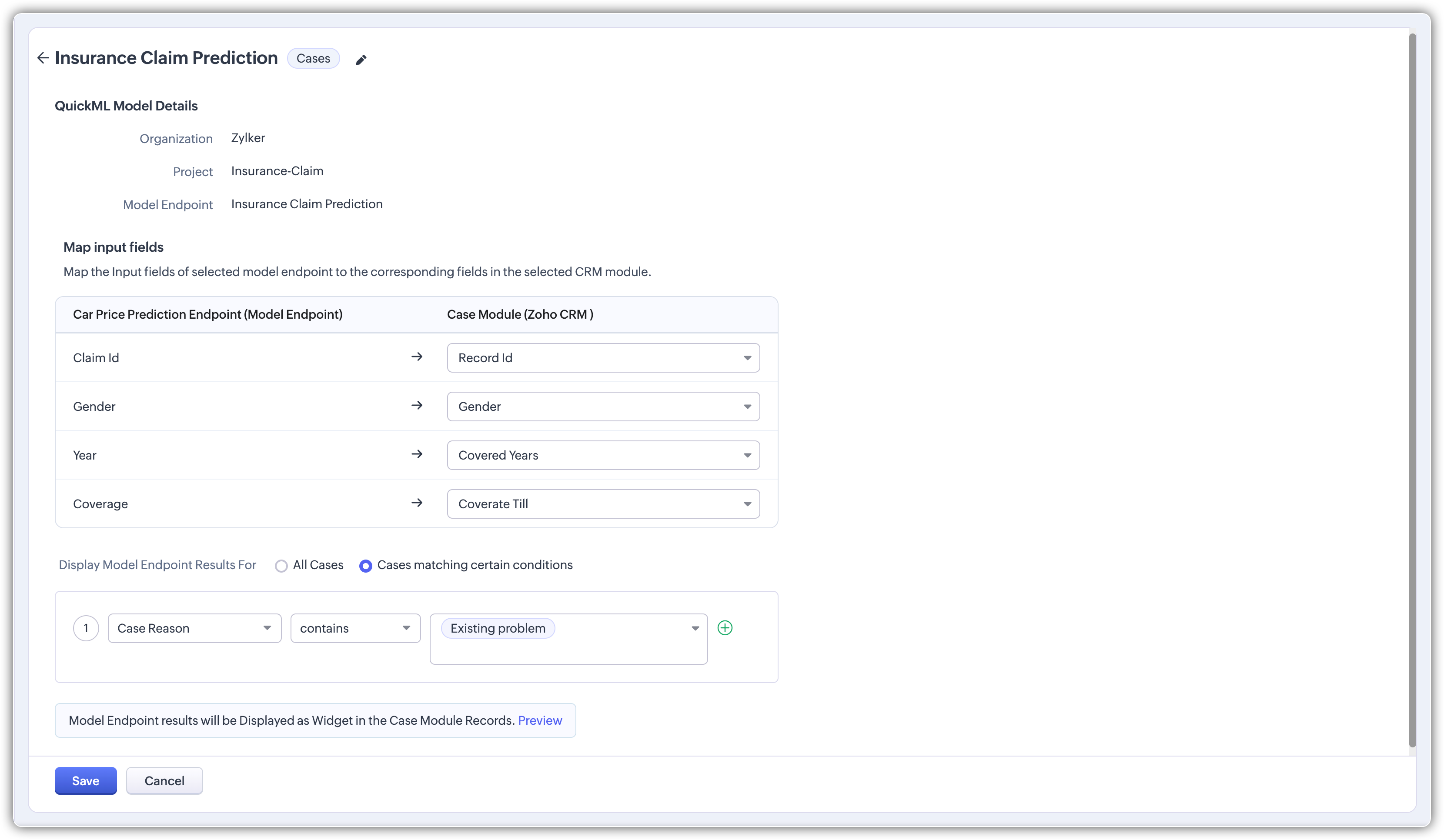 Once the model is trained and deployed in QuickML, it can be integrated into Zoho CRM through Custom AI Studio. Users will see the expected claim payout displayed directly within each claim record, helping teams process claims faster and maintain consistent decision-making across workflows.