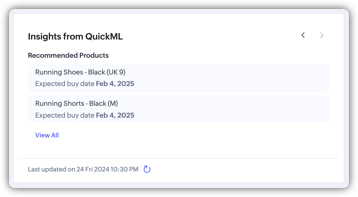 After the model is trained and deployed, it is integrated back into Zoho CRM. When a user opens a customer record, the CRM displays personalized product recommendations generated by their own QuickML model.