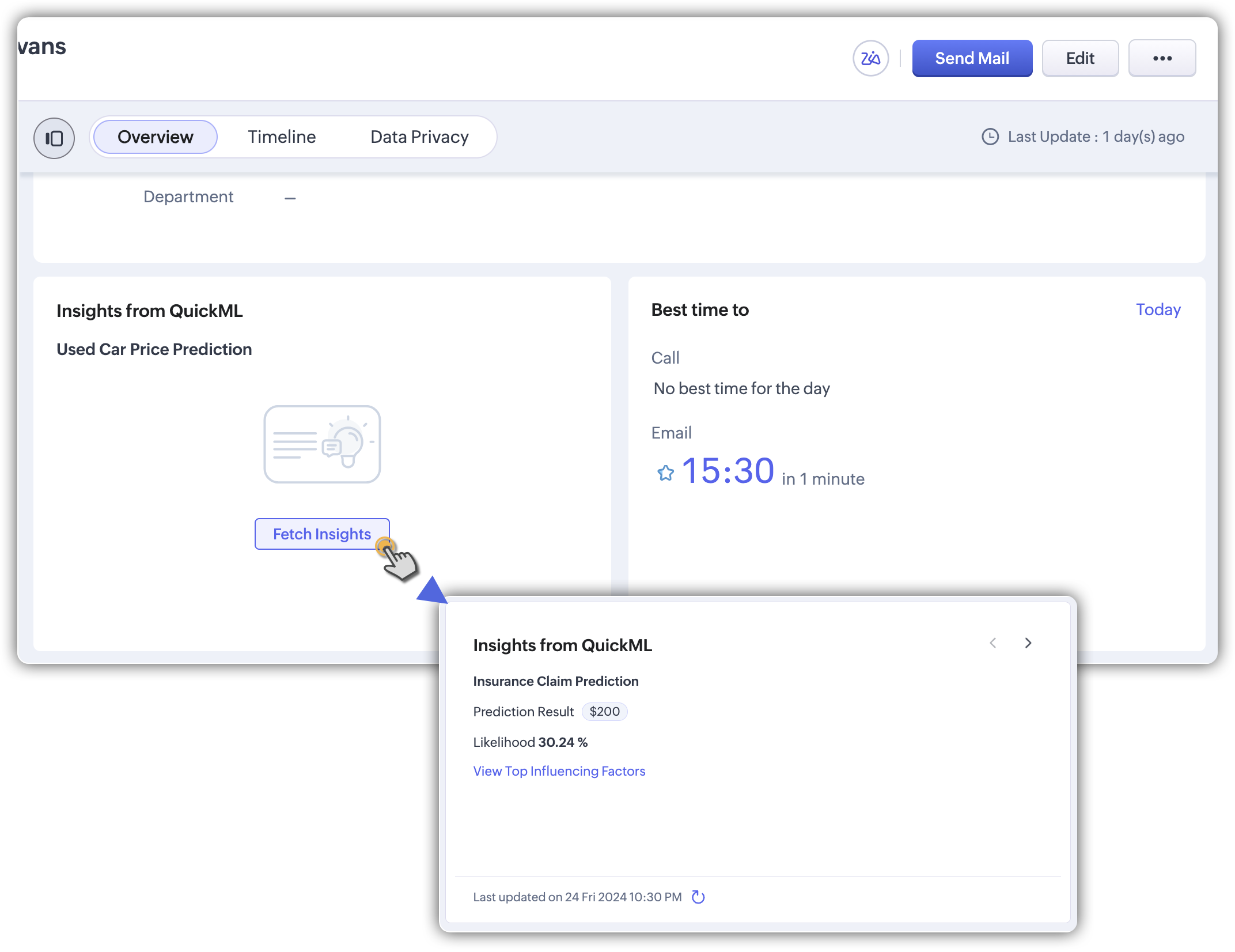 Once the model is integrated, the widget titled Insights from QuickML displays the respective model output in the record detail page.