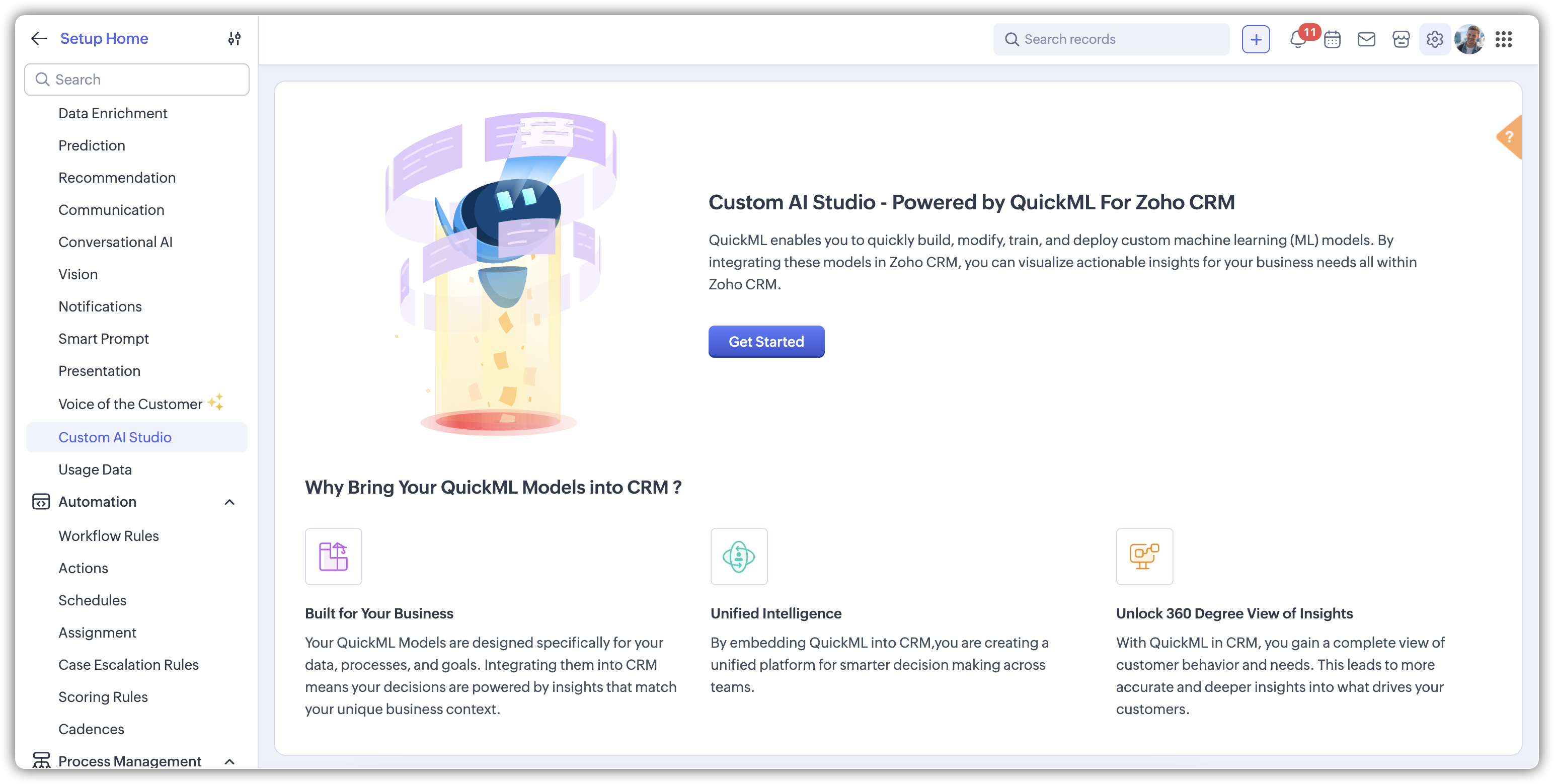 You can access the QuickML integration in the setup page of your CRM org, simply navigate to Setup > Zia > Custom AI Studio.
