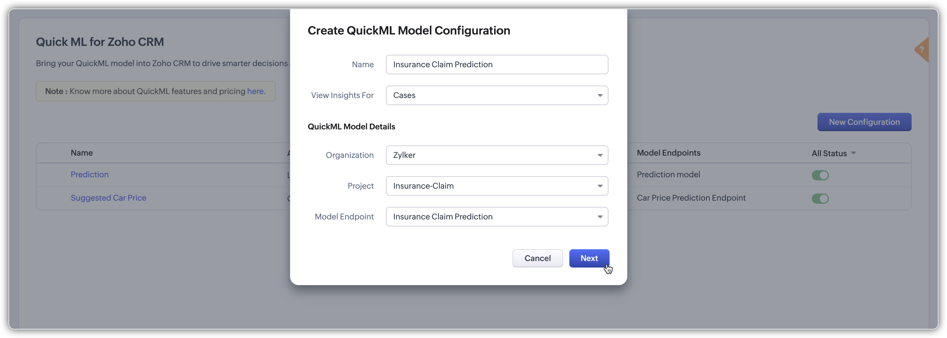 Note: Each model endpoint in QuickML represents a deployed ML model. You can create multiple configurations under different CRM modules (up to four per module).