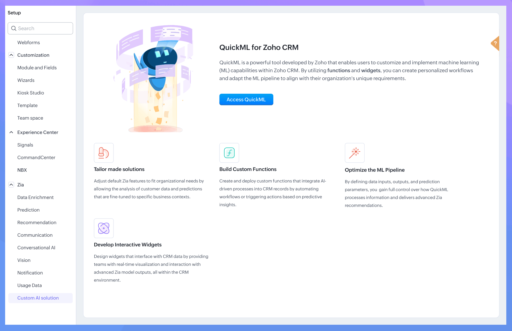 Zoho CRM's AI-powered assistant, Zia, as we all know, is designed to enhance customer relationship management by offering predictions, recommendations, etc. It brings numerous advantages, while Catalyst's QuickML feature offers the flexibility to build sophisticated customizations tailored to their needs. Businesses can integrate their CRM account with Catalyst, enabling platform AI capability.