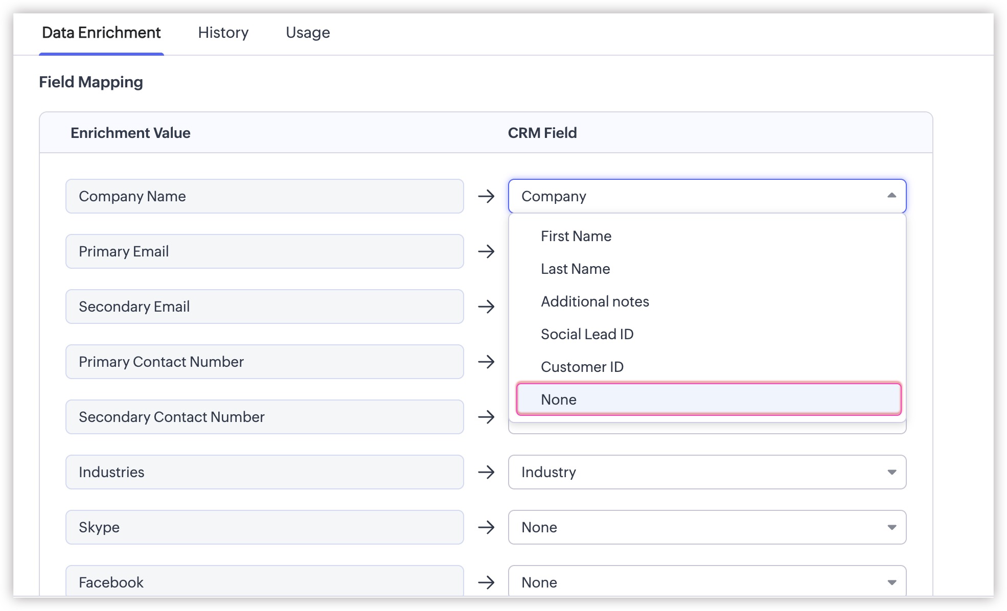 Users navigate to the field mapping interface after selecting their module and data type. This setup allows users to align their CRM fields with the enrichment source.