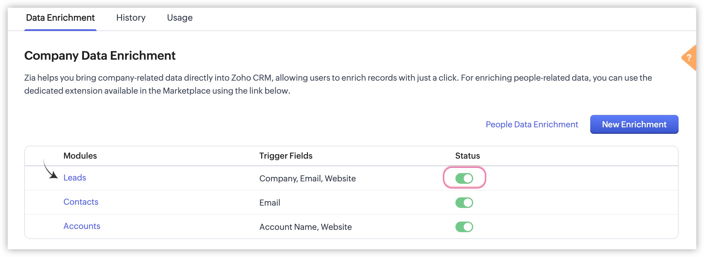 - Enable/disable: It is possible to enable Data Enrichment for selected modules only. For example, you can enable only for the leads and contacts modules and not for accounts module.
