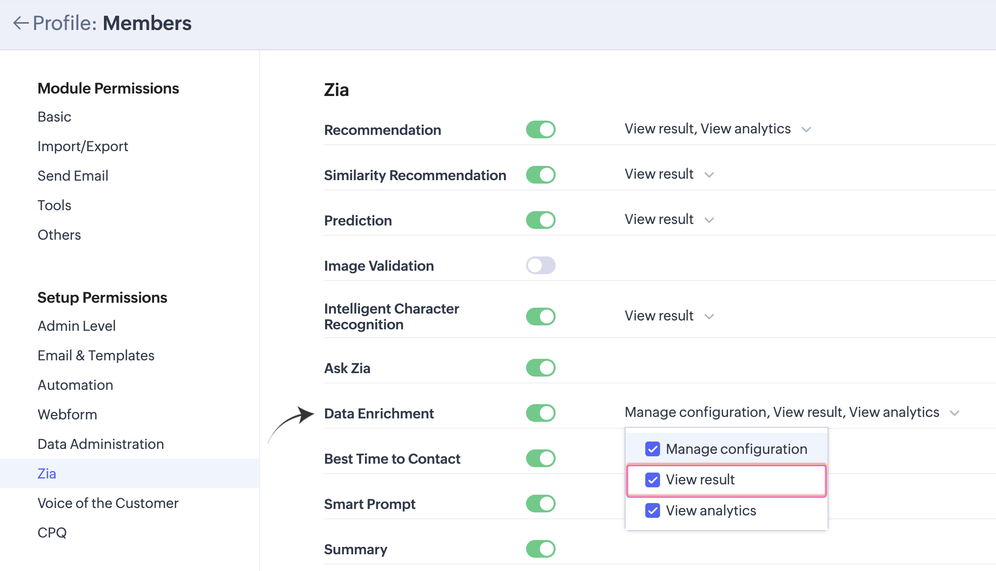 You can choose to disable Data Enrichment feature for user accounts based on your profile permissions, at any point after which Zia will stop enriching your records. All the records that are enriched by Zia until you choose to disable data enrichment, stays intact.
