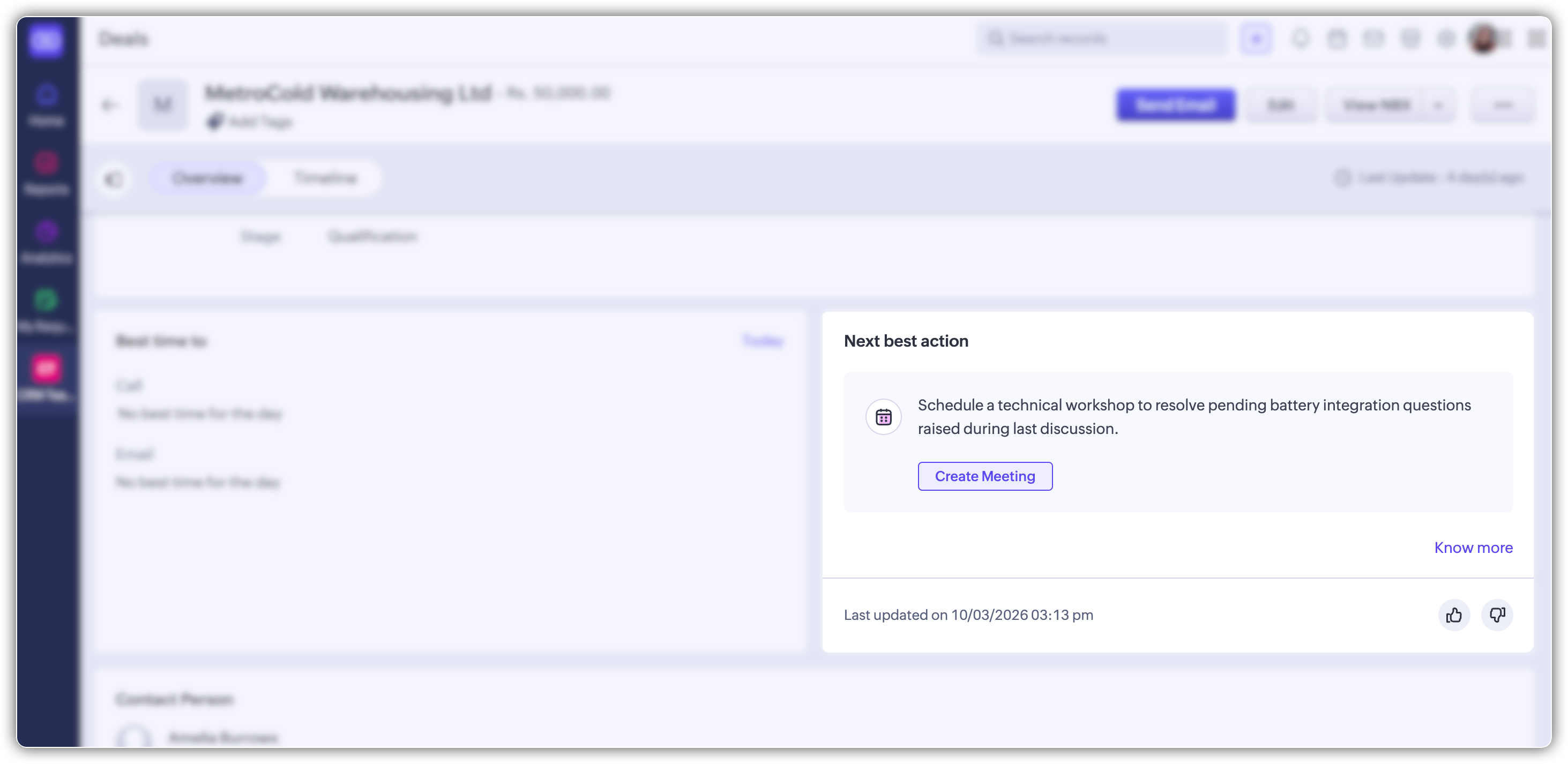 When a sales rep opens a lead, contact, or deal record in Zoho CRM, they often face a straightforward question: what should I do next with this record? The answer usually requires reviewing past interactions, checking engagement patterns, looking at deal stage history, and comparing with similar records—all of which takes time and context-switching across reports.