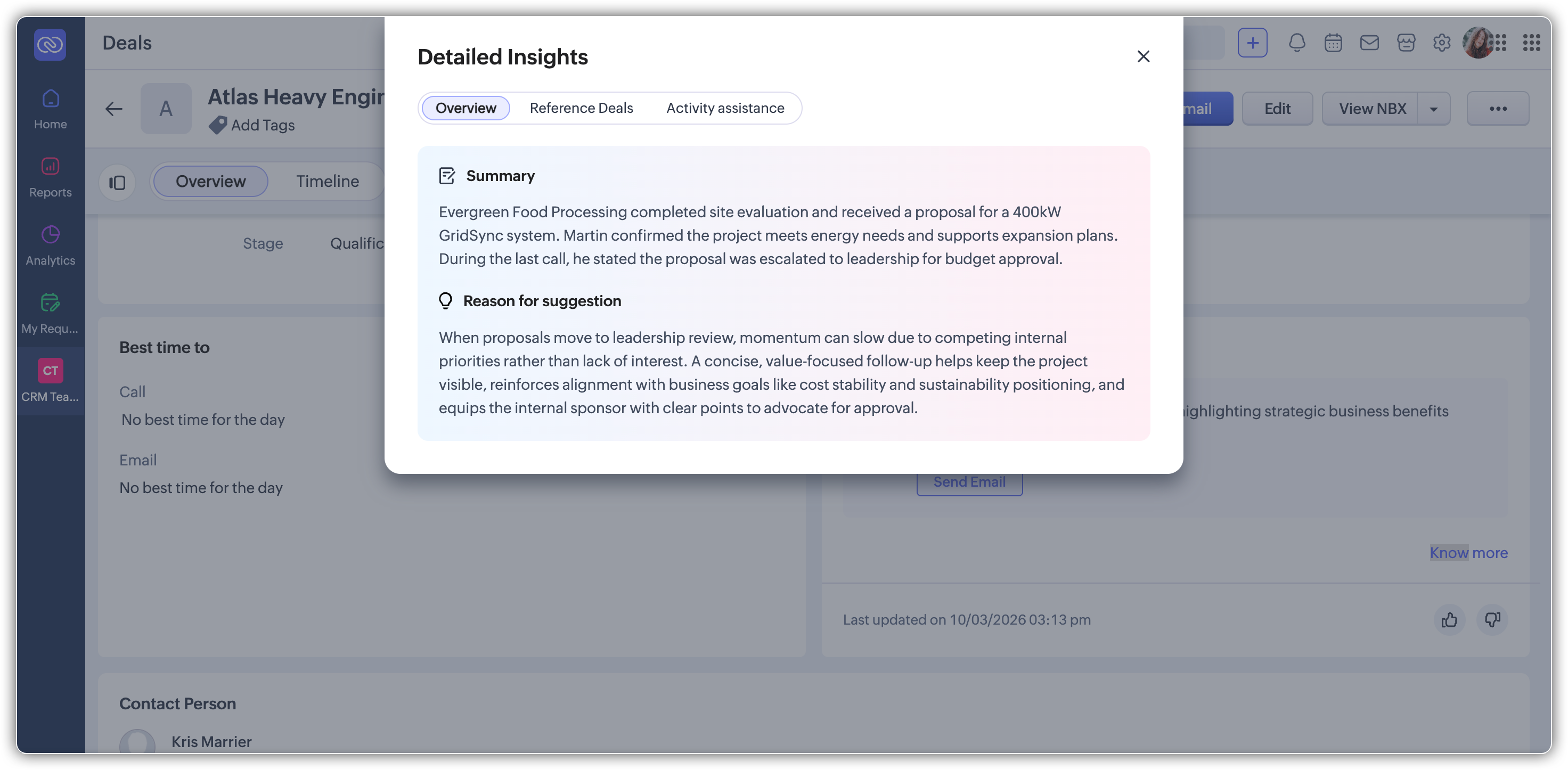 Clicking Know more on the Next best action widget opens the Detailed Insights panel. This panel provides the complete context behind Zia's recommendation and is organized into three tabs: Overview, Reference Deals, and Activity assistance.