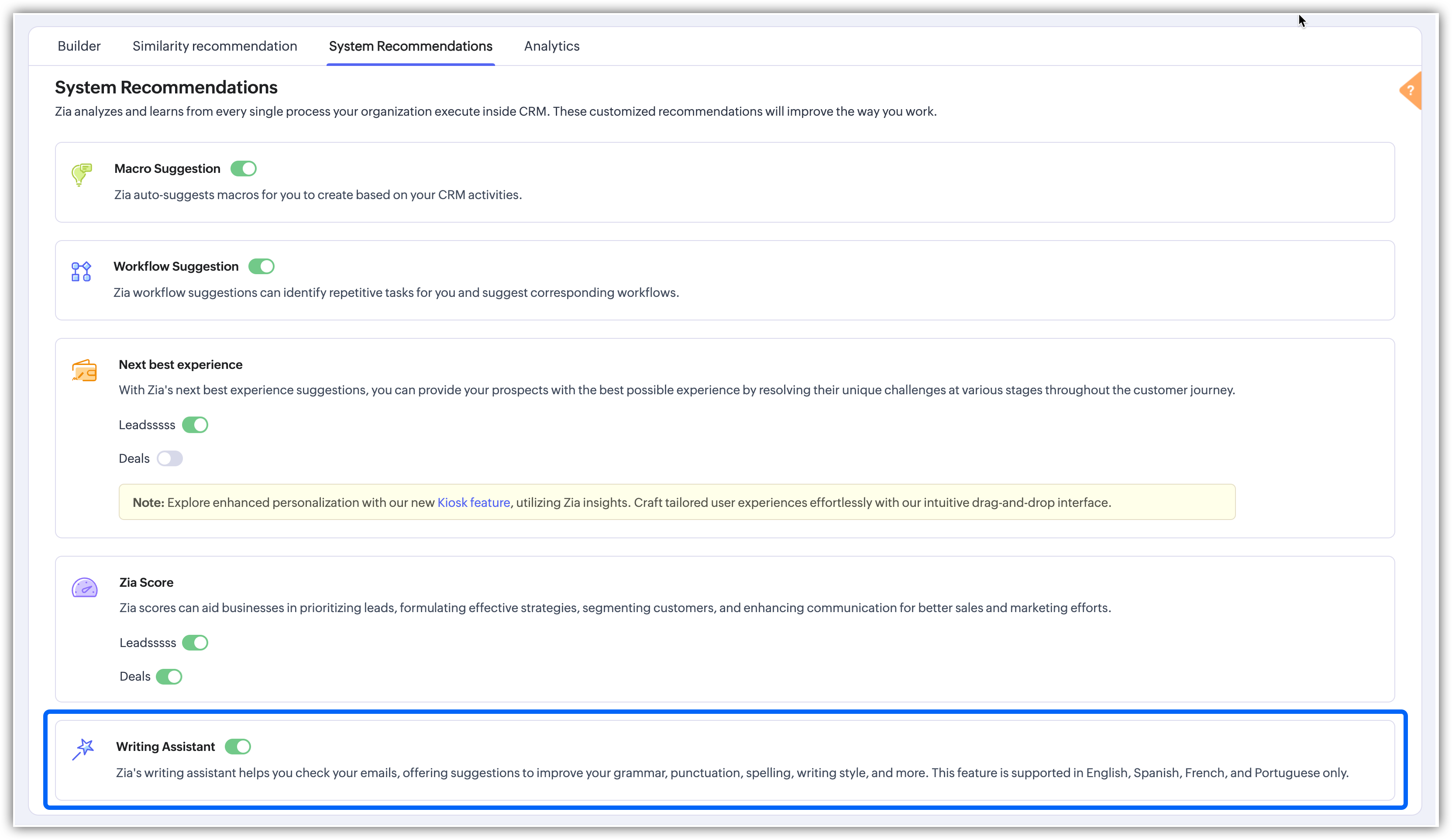 The writing assistant is enabled by default. You can enable or disable it based on your preference.