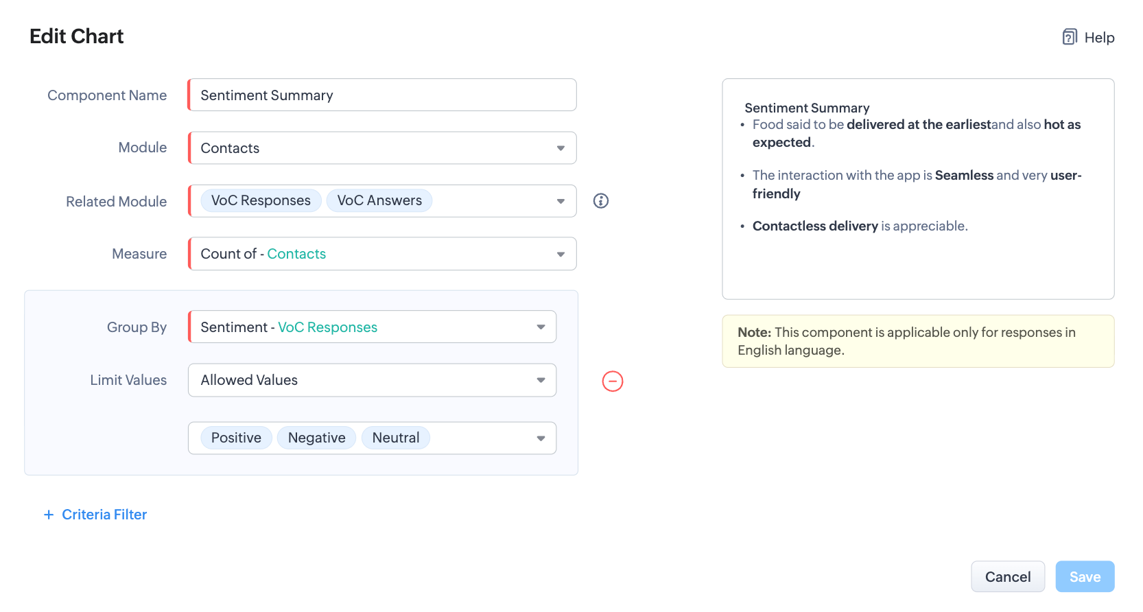 Imagine you are a customer success manager looking to understand the experience of the customers you recently onboarded. A summary dashboard created based on VoC Responses and VoC Answers makes an ideal choice to understand their experience. With measure as count of VoC Responses, you can see “how many” of these responses carry the attributes and when grouped by sentiment or emotion, or customer satisfaction, you can collate all the VoC responses, its count, as crisp summaries with the respective sentiment, emotion, or customer satisfaction as the theme of the component.Here’sHereWith