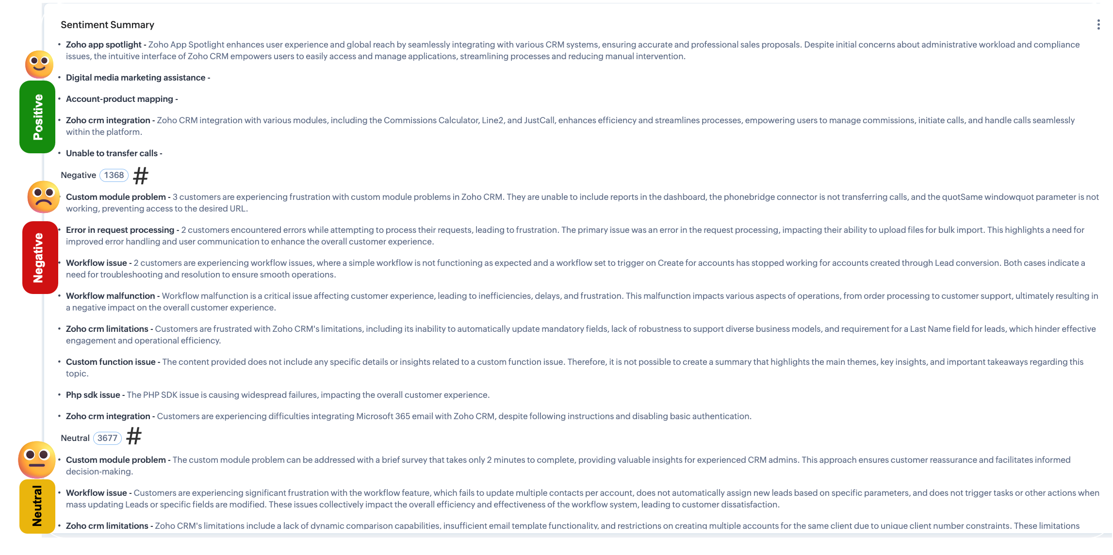 - Further, they are collated (based on the module and related module) and classified based on sentiments, owing to the group by settings.