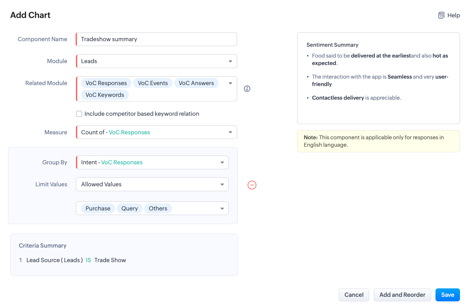 - Click Add and Reorder to arrange the component amongst the other components in the dashboard before you add them.
