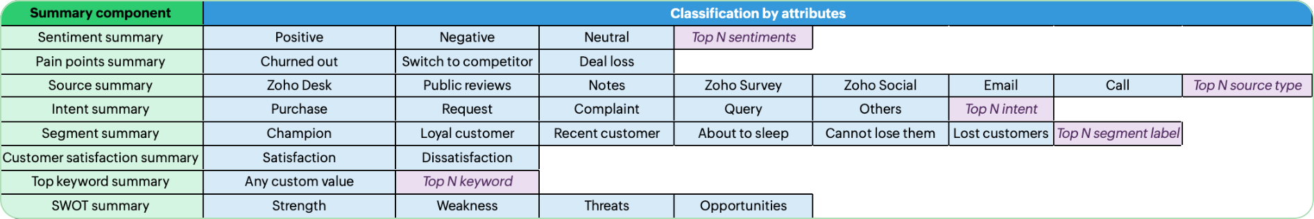 A summary component is a text-based analysis, that lists insights from your consumers’ response as bulletins and they are classified based on their own attributes.