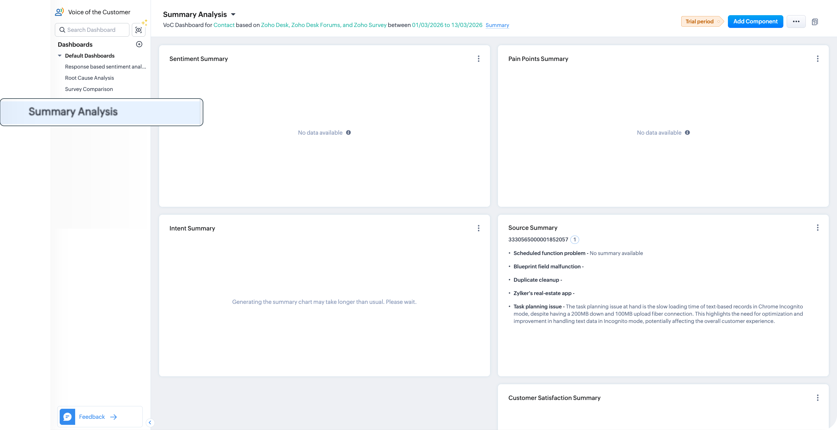 To use the default summary dashboard, you can click the summary analysis under the default dashboards of the Voice of the Customer module. It will have all types of summaries. You can use them as such or change the dashboard configuration.
