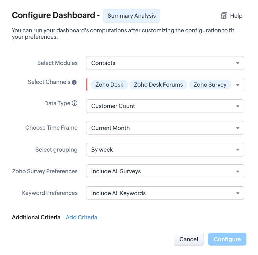 - Change your preferences of modules, source channels, data type, time frame, grouping, preferences, keyword preferences, and criteria as required. Click Configure.