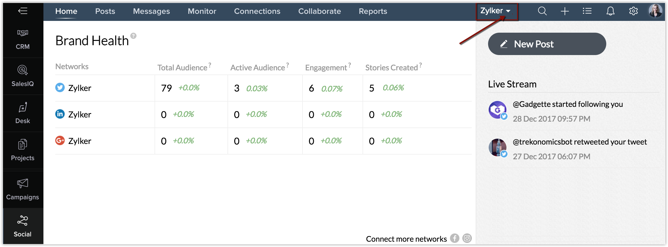 1. Access Zoho CRM Plus and click the Social icon () displayed to the left of the page to access the Zoho Social application. You'll see the brand name displayed on the top-right corner of the Social Home page.