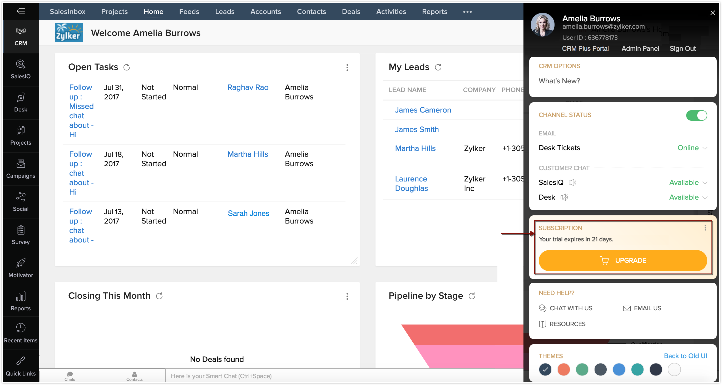 2. Click Upgrade displayed in the Subscription section and follow the steps given in this link to upgrade to the CRM Plus plan.