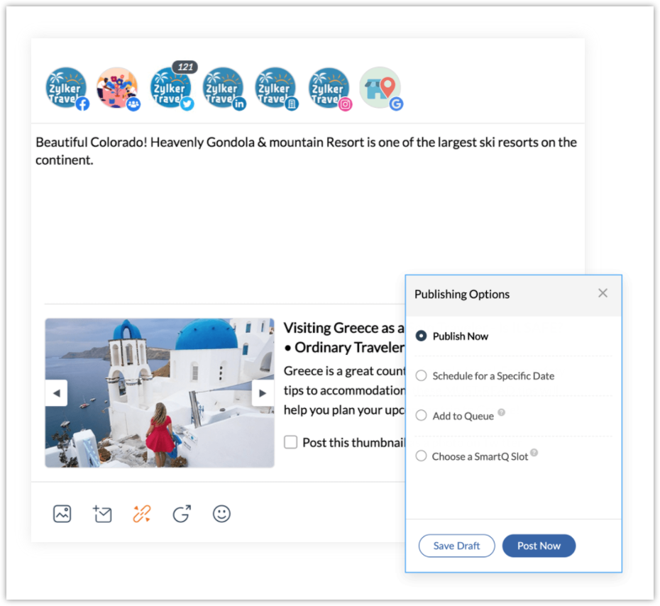 Various posts can be created and saved as drafts, to be reworked. You can also choose to discuss with your team members, gather their feedback and incorporate them before publishing. You can also schedule posts to be published at a specific date and time. You also have SmartQ, which predicts the date and time in which there is a high chance for an increase in the audience traffic.