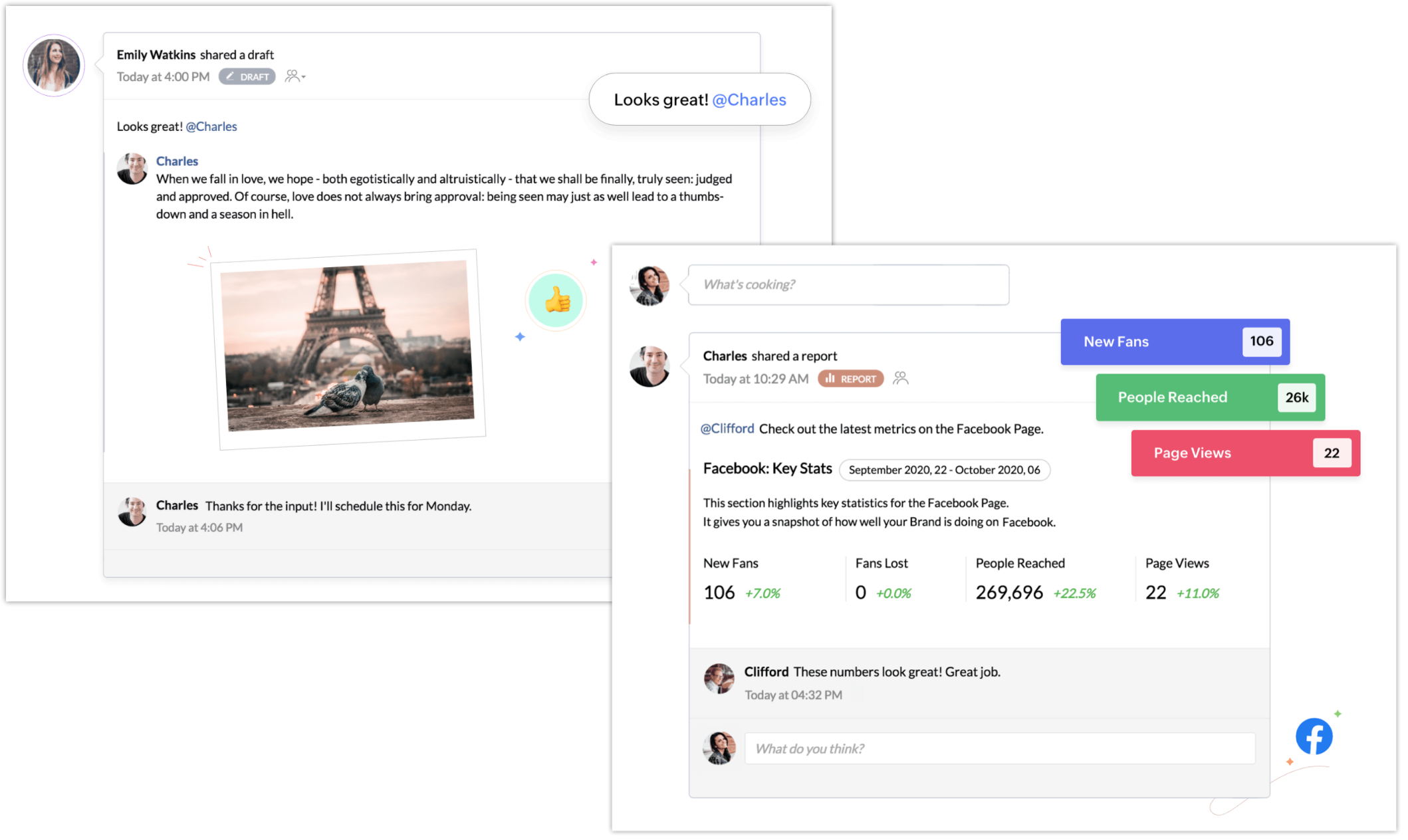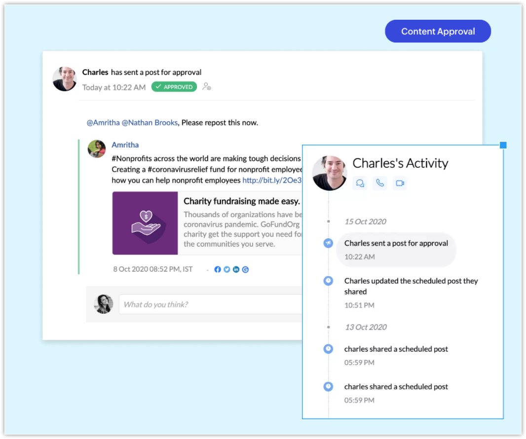 Social media posts can be sent as drafts for approval before they are published. Users with the Publisher role can create these drafts and send them for approval, which can be approved by users with Approver permission. They can also update, or reject the post from getting published. If rejecting, they can include a reason for rejection, which will be shared with the publisher.