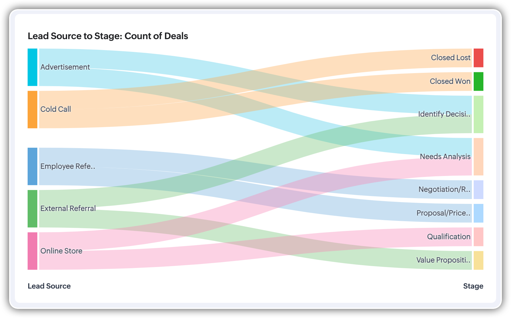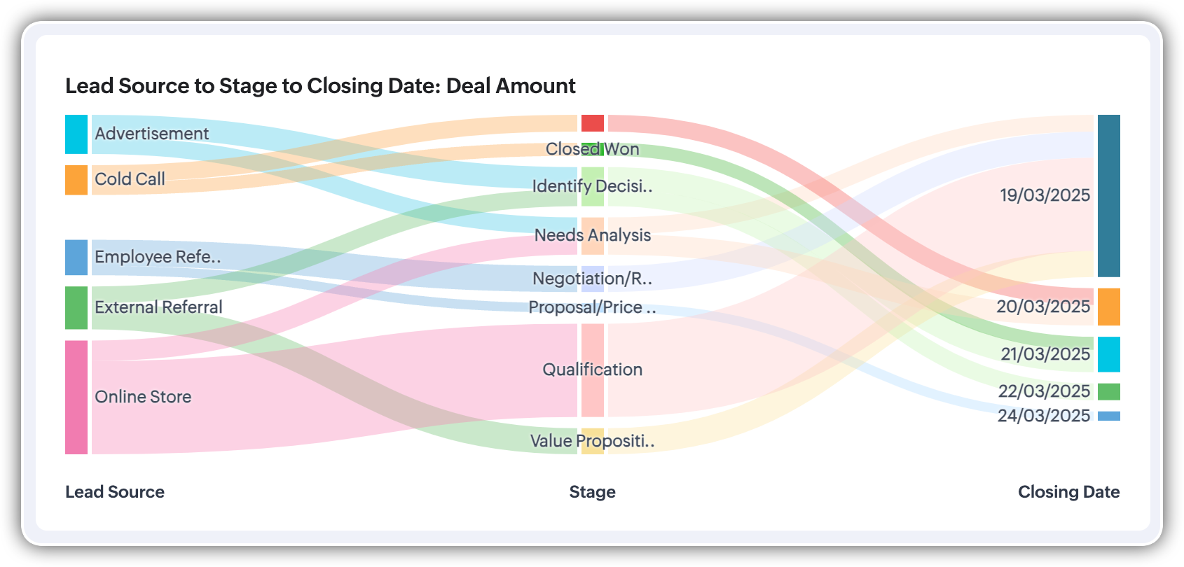 Let's say you want to know which lead sources are bringing in the highest revenue and how deals progress. You can create a Sankey chart for measuring the count of deals, and the flow of records is from the lead source to the deal stage. After analyzing which lead sources are bringing in the highest revenue and tracking how deals progress through the sales stages, you might discover that online marketing generates many early-stage deals while partner referrals, though fewer in number, yield higher revenue in later stages.