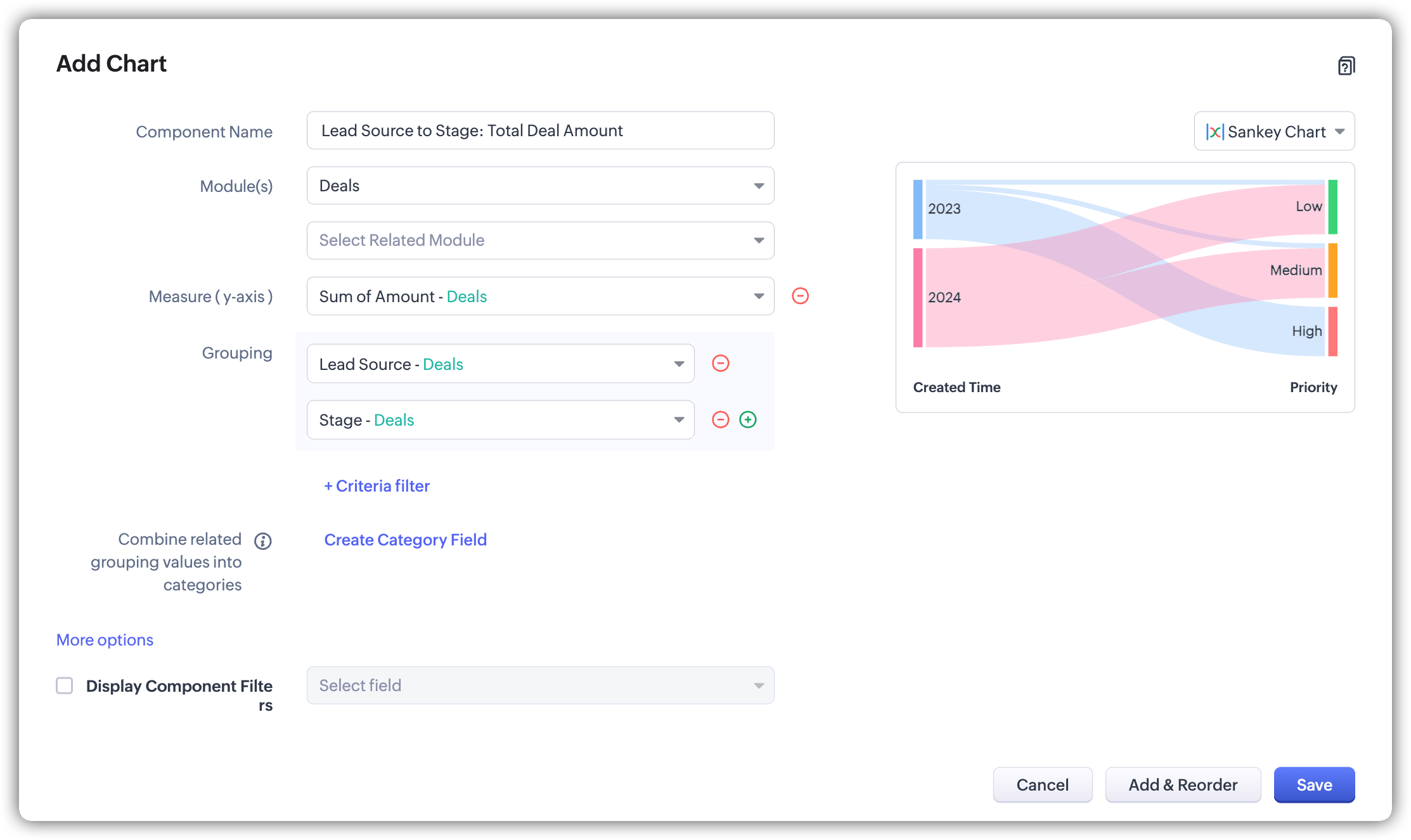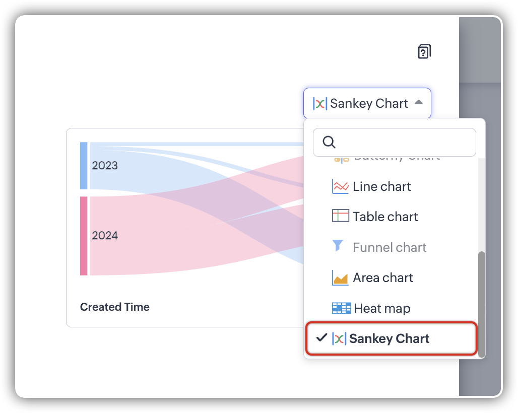 A Sankey Chart is designed to highlight the movement of data across different segments. Unlike traditional charts—such as bar, column, pie, or donut—that mainly provide a static distribution of values, the Sankey Chart focuses on illustrating the flow between multiple segments or grouping fields. This makes it an ideal choice when you want to track how values (like lead counts, revenue, or deal statuses) move from one category to the next.