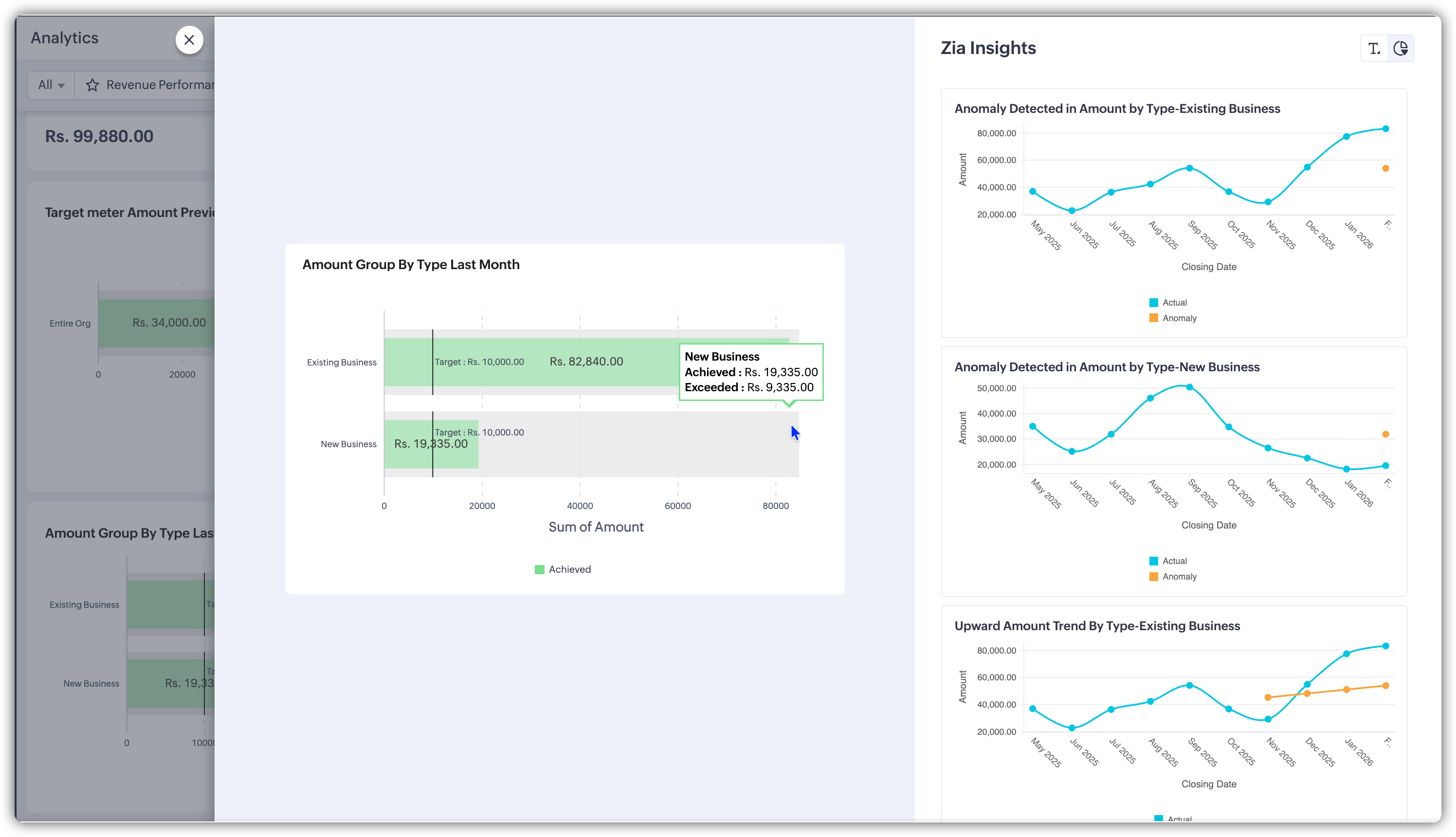 When you open a dashboard in Zoho CRM, the components on it—KPIs, target meters, charts—give you a snapshot of how things are going. You can see that revenue is up, deals are slowing down, or a target is off track.