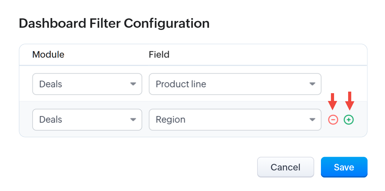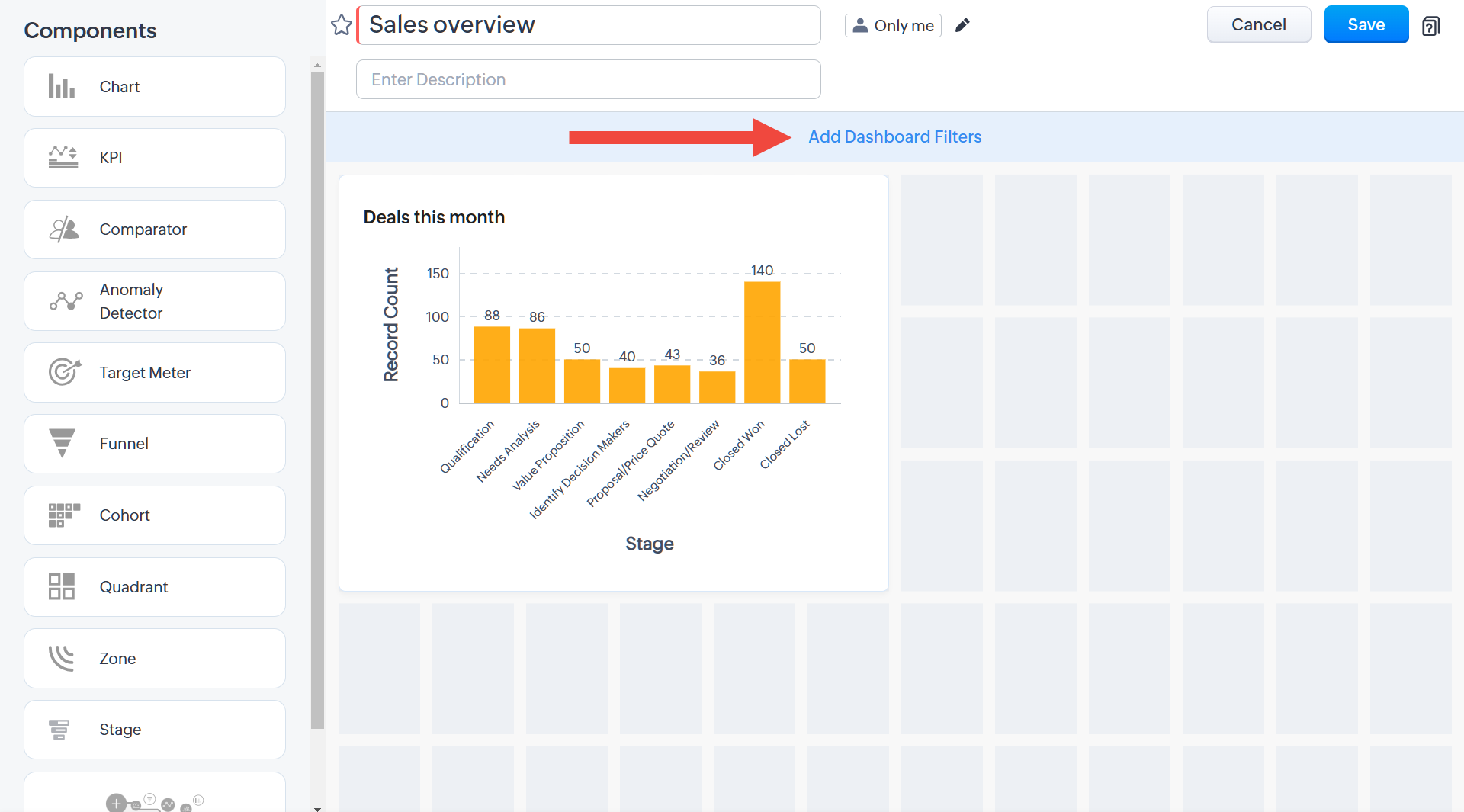 The dashboard filter is applied across all relevant components. For example, if a dashboard filter with a Stage field from the Deals module is applied. This will only affect components associated with the Deals modules. Components which have not been filtered will be marked with the warning icon.