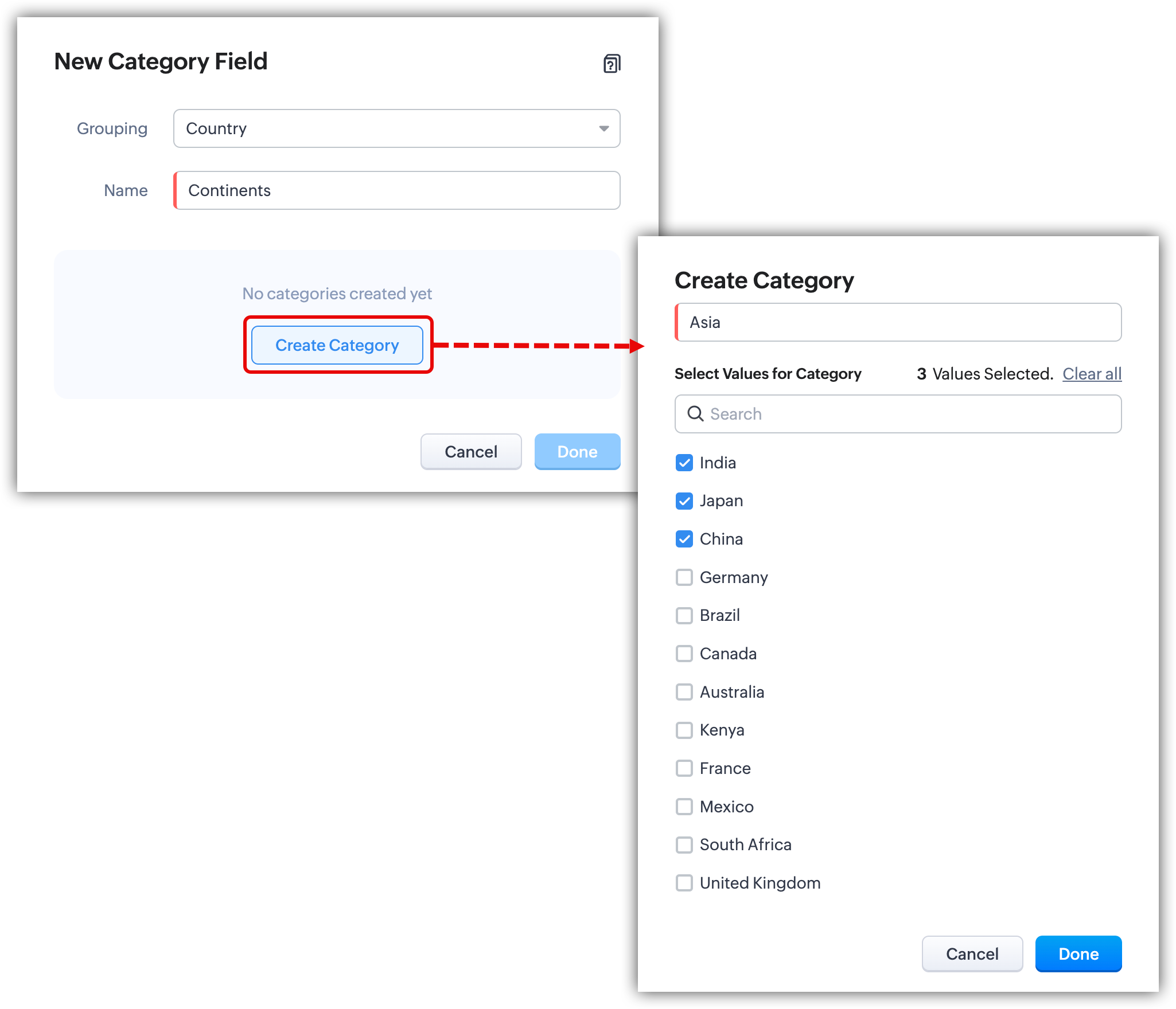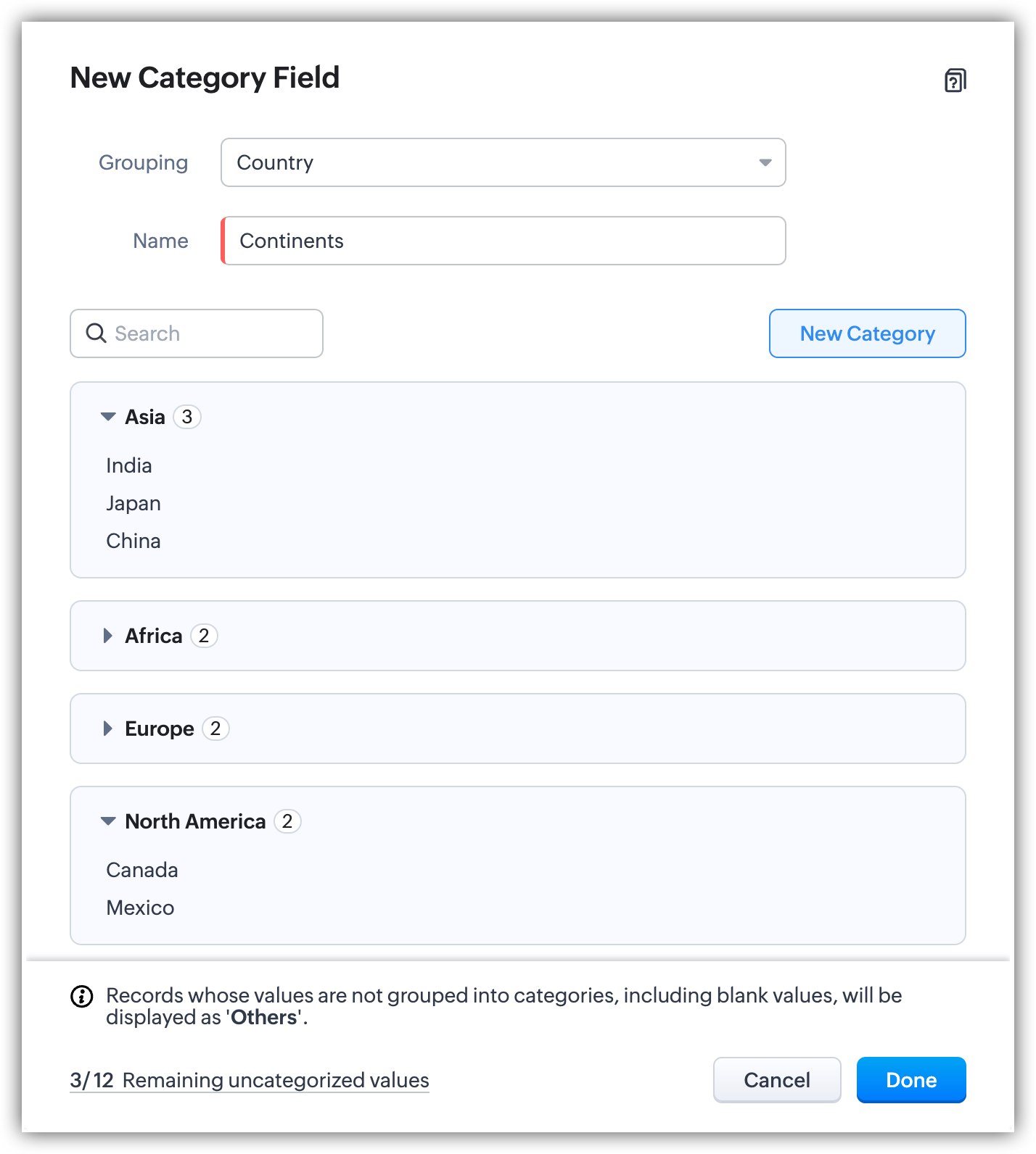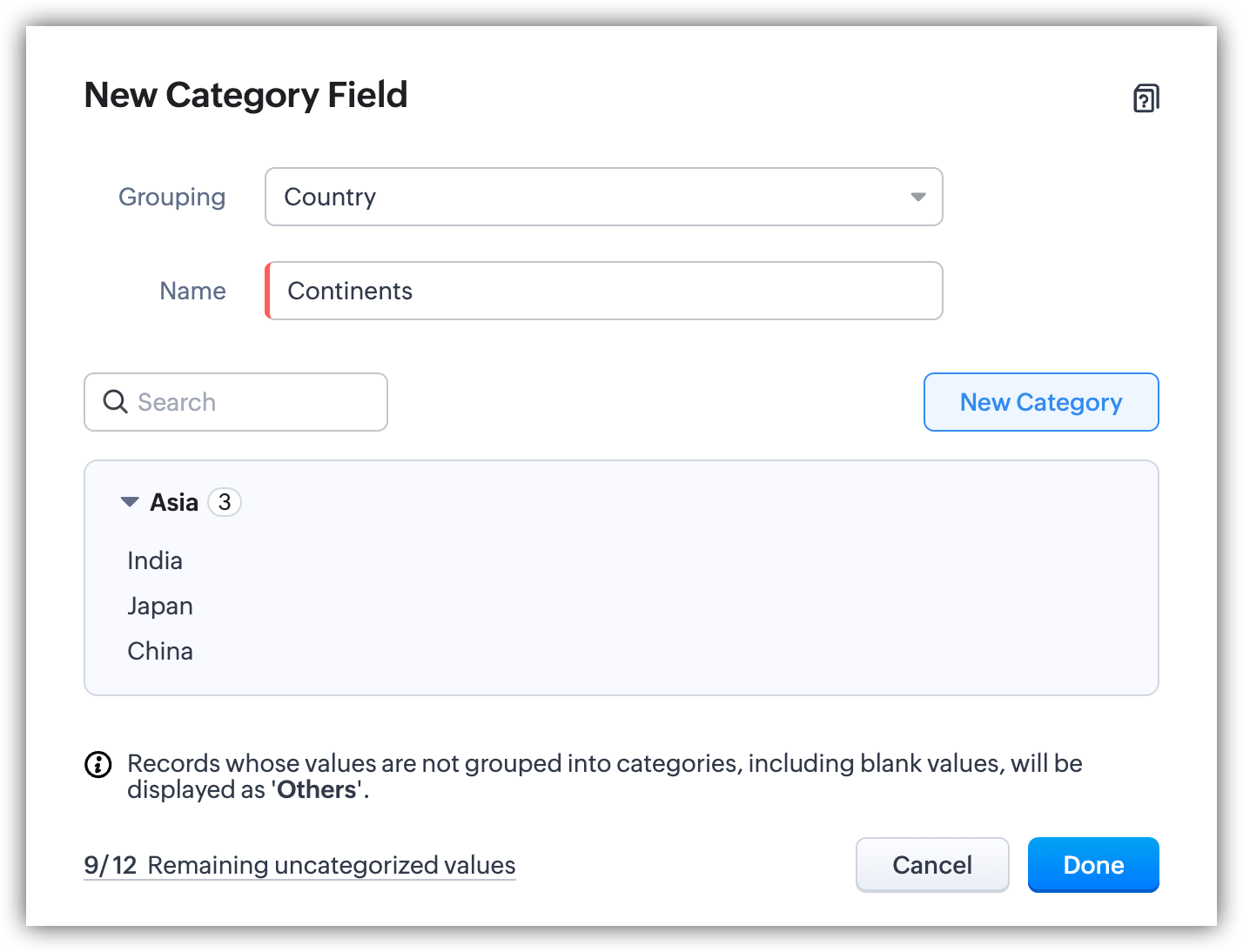 - Give a name to the category (eg. Asia) and select the grouping/picklist values (eg. India, Japan, China).