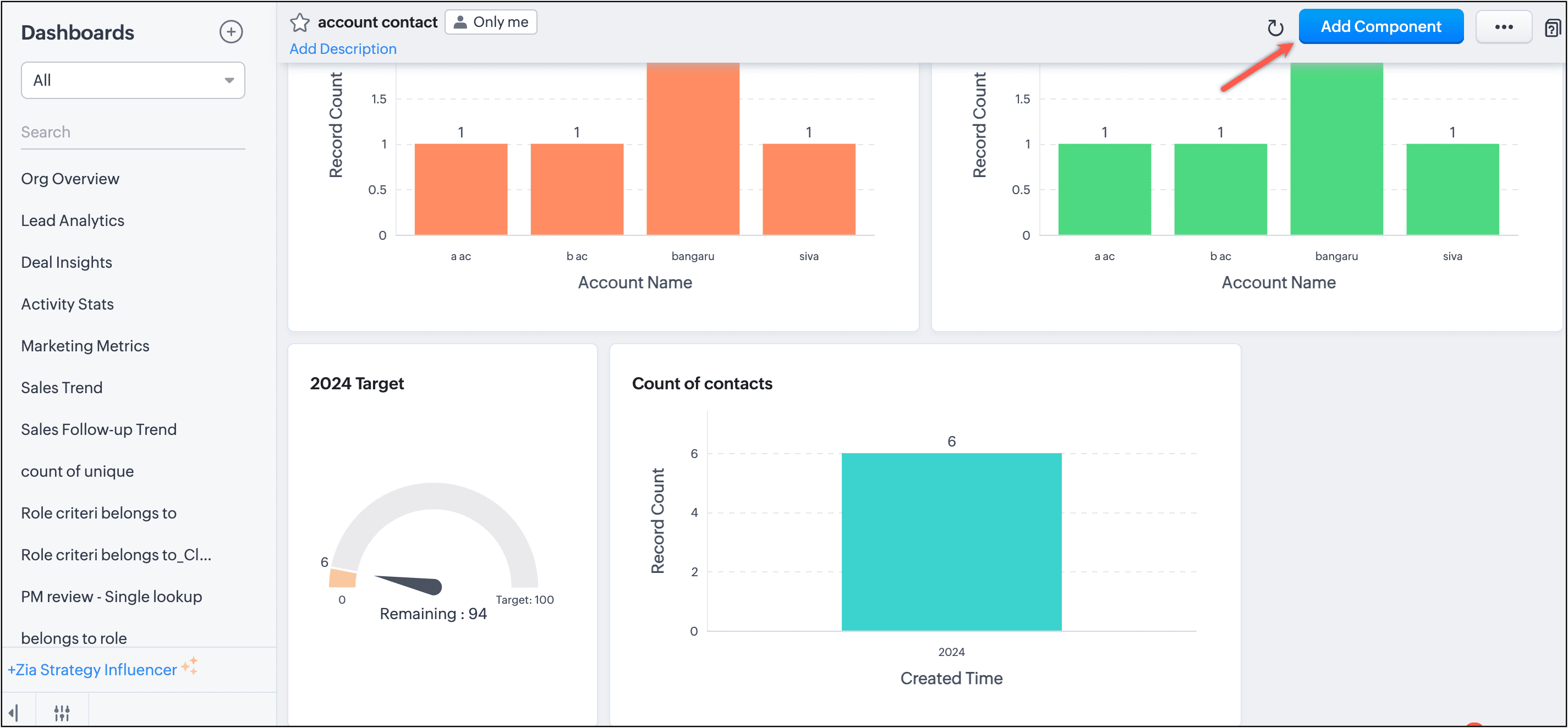 - Navigate to Analytics or Dashboards. Click Add Component on the top-right of the screen of your desired dashboard.